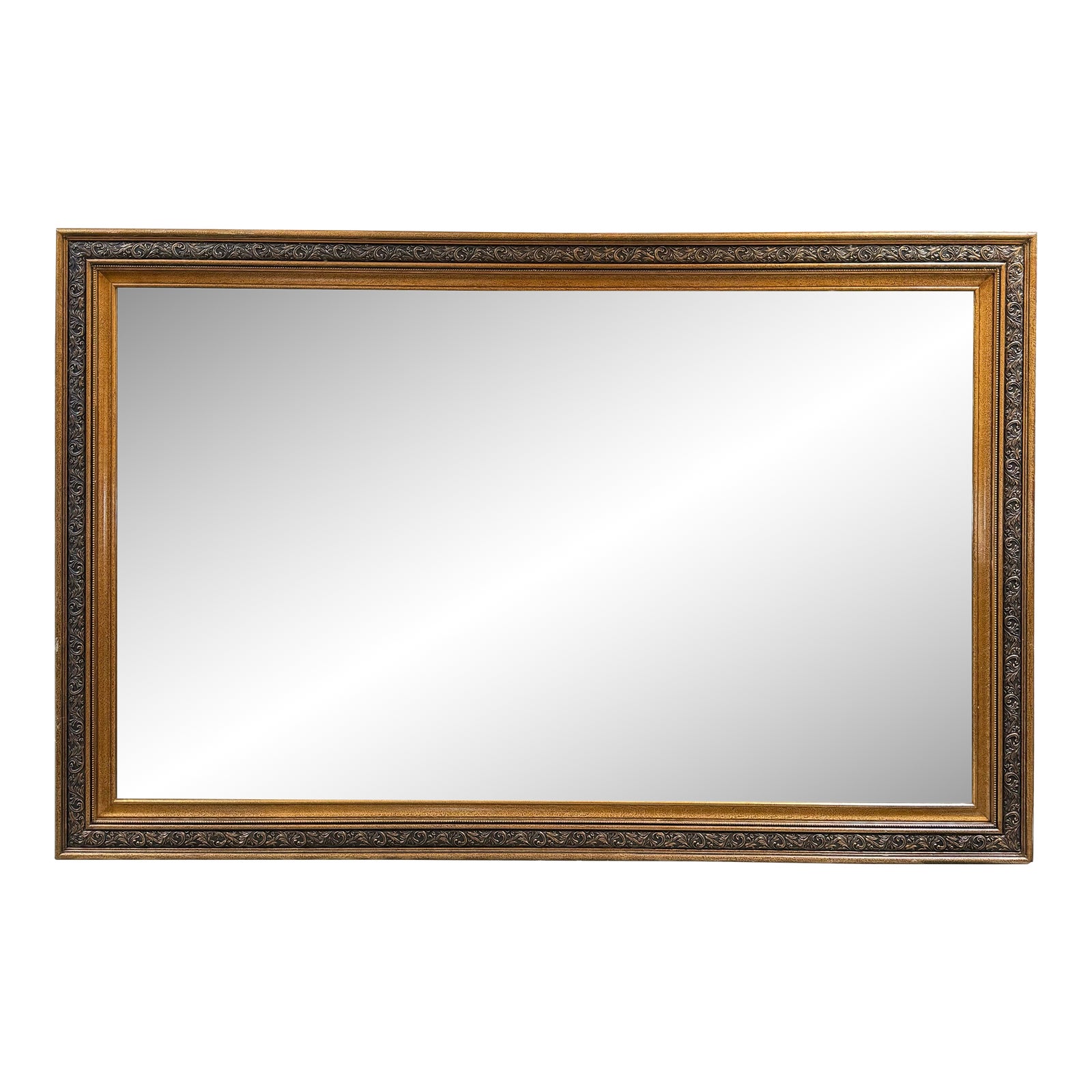Design Plus Gallery presents an Antique Style Wall Mirror. A large expanse of beveled mirror is framed in a beaded wood frame. The embossed leaf pattern has a gilt finish overlaid with a dark bronze. Beautiful above fireplace, at entryway or in dining room. Light surface wear condition is good for age and use.