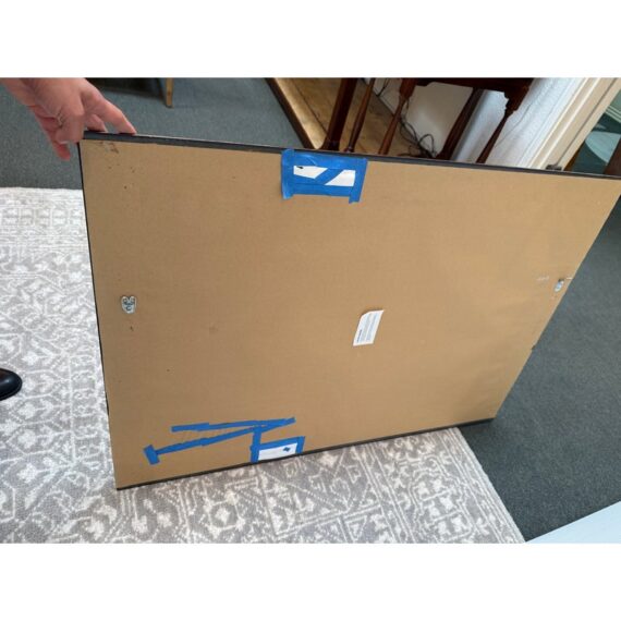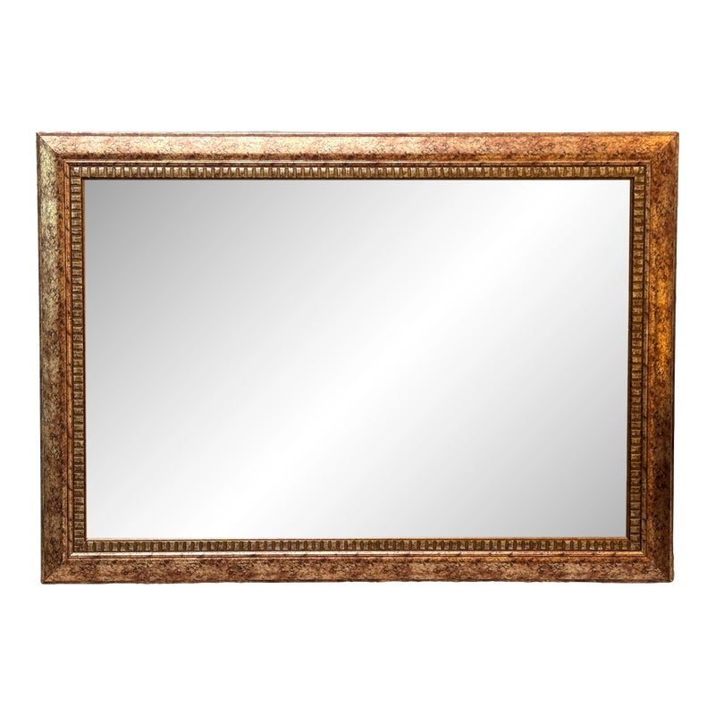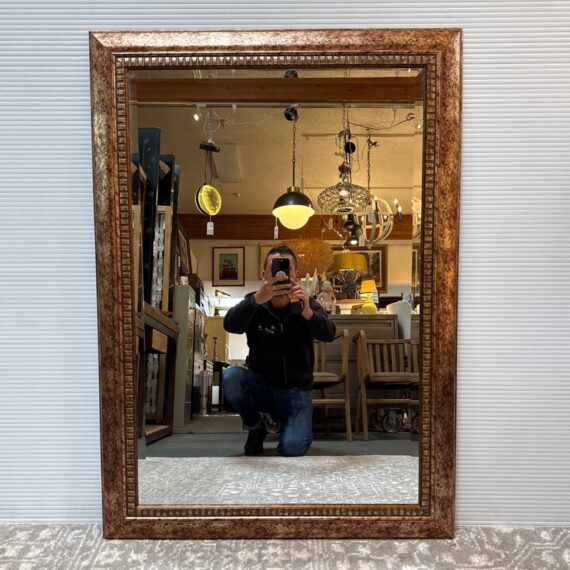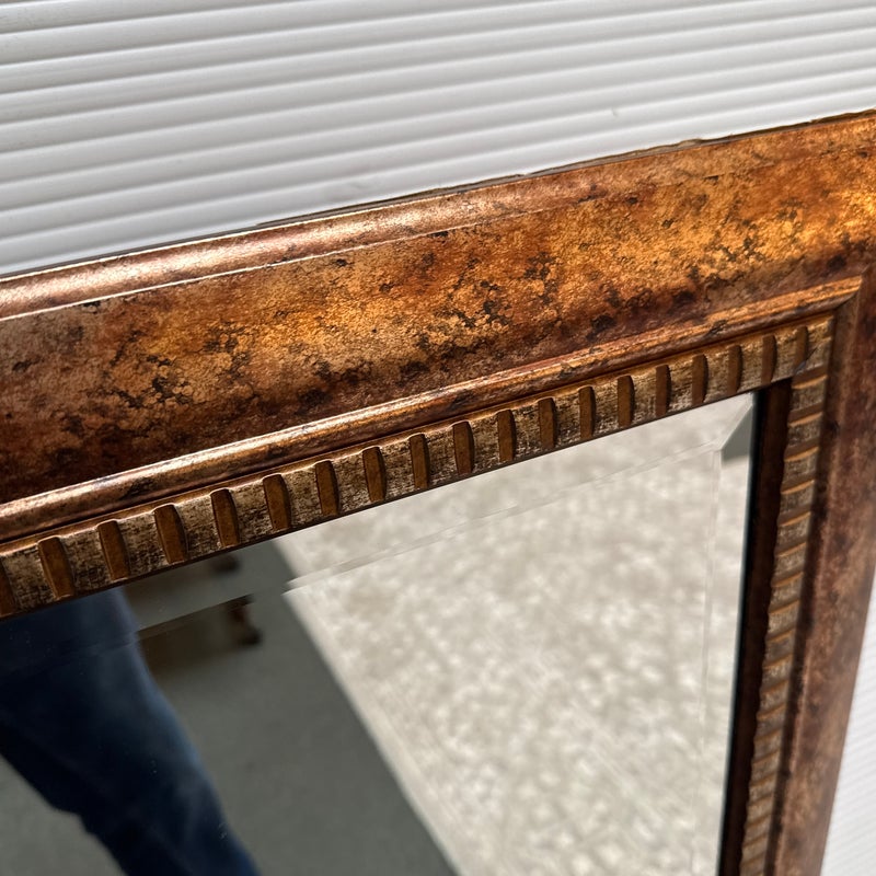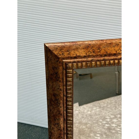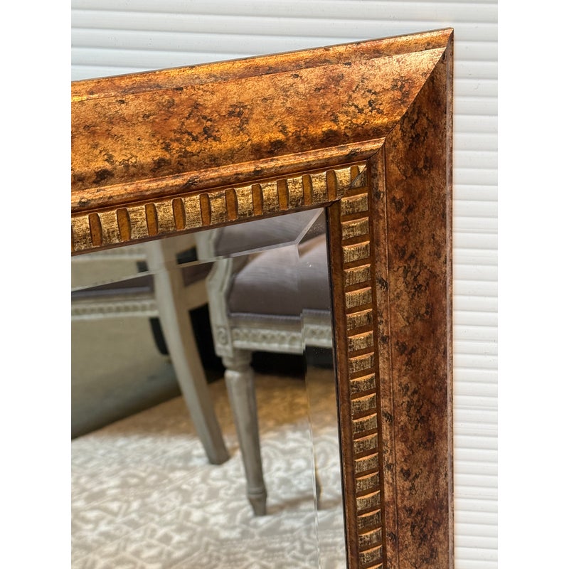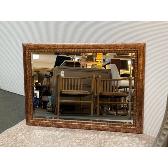 Design Plus Gallery presents a Vintage Style Wall Mirror. The narrow beveled mirror is framed in a faux finish that expertly mixes gold and copper hues. The large expanse of mirrored glass reflects your good taster. Fittings on back allow mirror to be hung with horizontally or vertically. Light surface wear; condition is consistent with age and use.