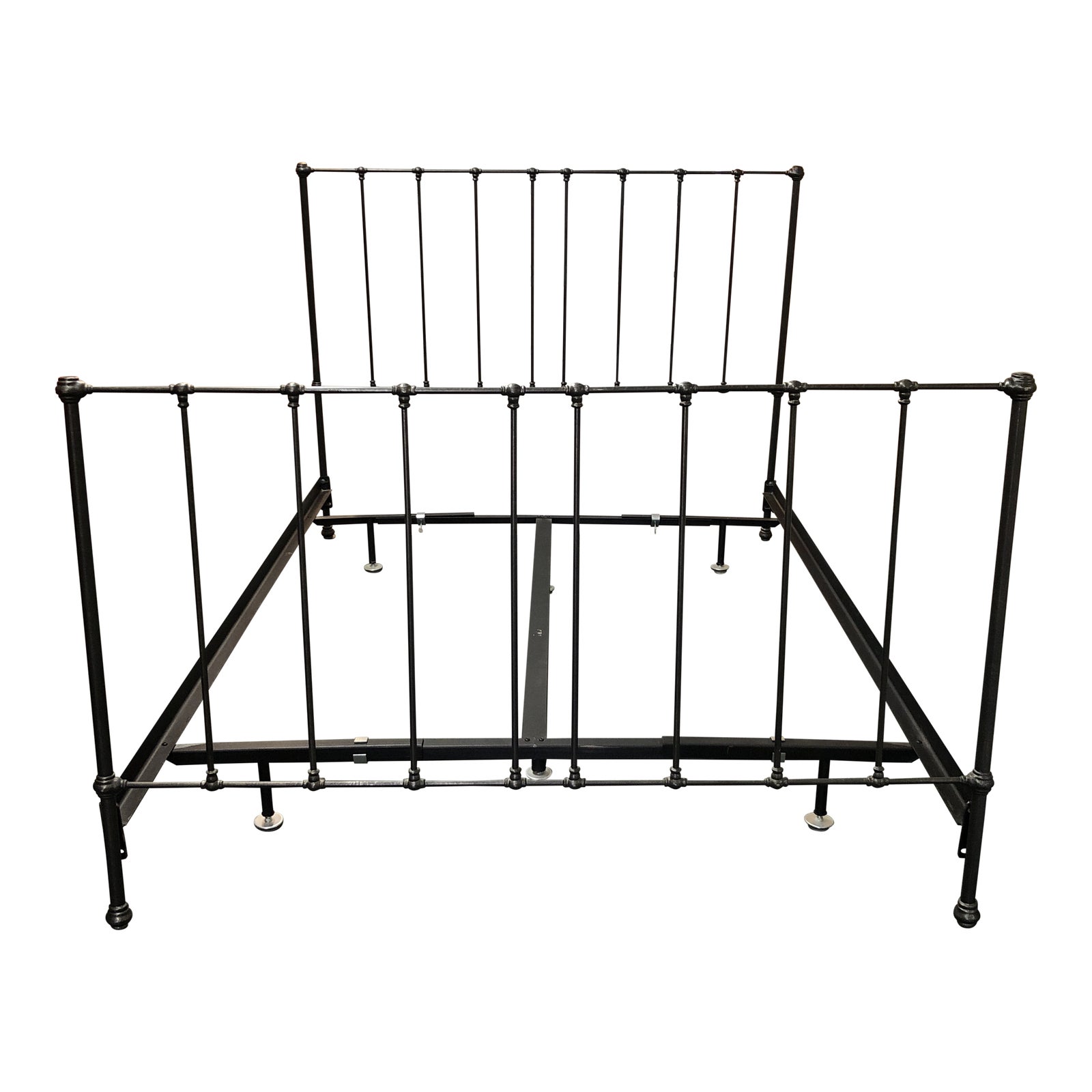 Design Plus Gallery presents an Iron Bed by Pottery Barn. An airy silhoutte, the queen size bed brings simple charming vintage style to bedroom or guestroom. Dark gray powder coated finish, on decorative headboard, footboard and utility frame