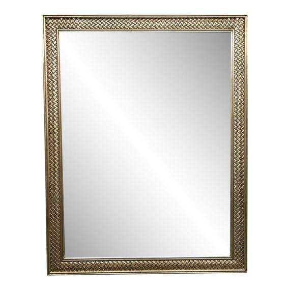 Design Plus Gallery presents a Vintage Style Silver Weave Wall Mirror. A rectangular mirror with beveled edges is secured in a wooden frame with a silver and gold wash finish. The field of the frame displays an abundant diamond weave pattern. Two sets of metal loops are attached in the back for mounting. Minor wear from use; mirror is in good condition.