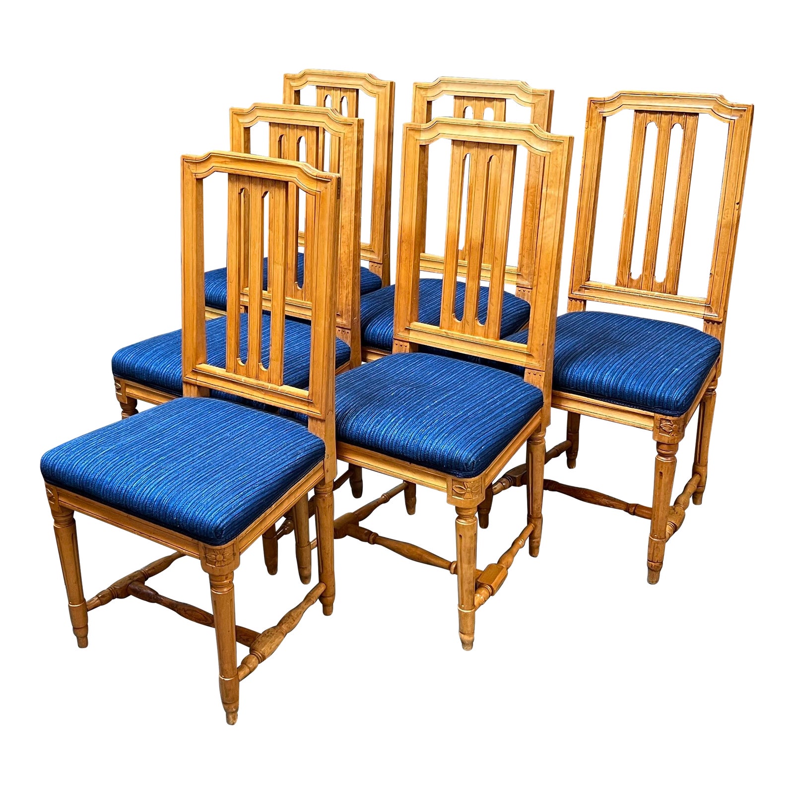 Design Plus Gallery presents a Set of Six Vintage Swedish Dining Chairs. This unique set features a trestle base with an upholstered blue fabric seating. The chairs are made of solid wood and are in good condition with natural aging. The chairs are perfect for adding an eclectic touch to any dining room. The chairs have a classic design and a timeless appeal, making them a great choice for any home. Two chairs are slightly wobbly. Visible and minor wear from usage + age.