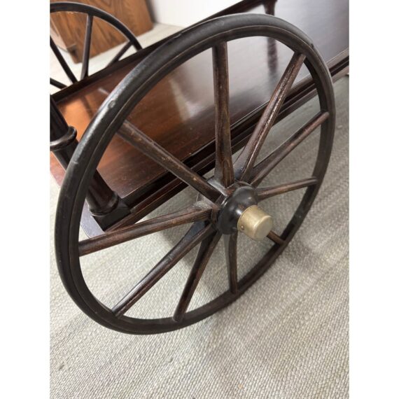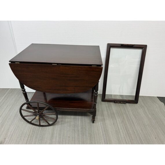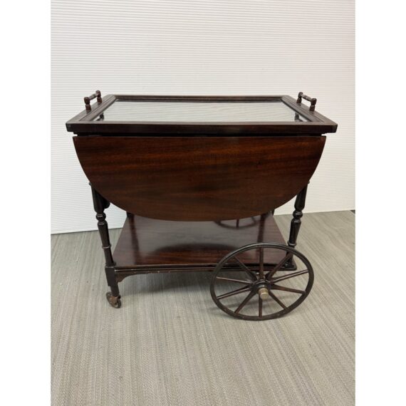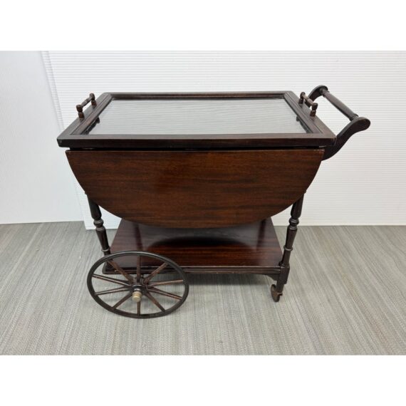 Design Plus Gallery presents a Vintage Tea Cart from The Paalman Furniture Company. The lovely expandable cart is full of surprises and ready to delight. The top, with removable glass tray, has a pair of leaves that doubles your serving space along with a handle that drops out of the way. Large and small wheels allow the trolley to move exactly where needed, easily. Visible surface wear; condition is consistent with age and use. Made in Grand Rapids Michigan, USA.