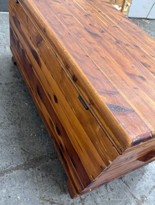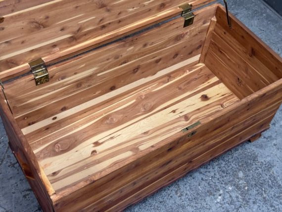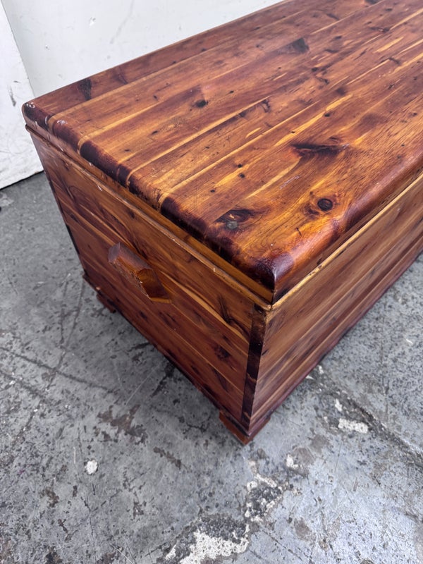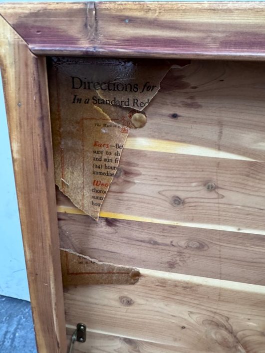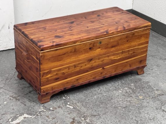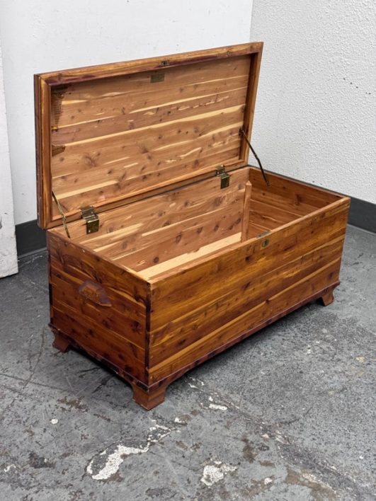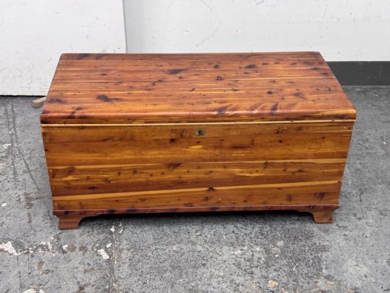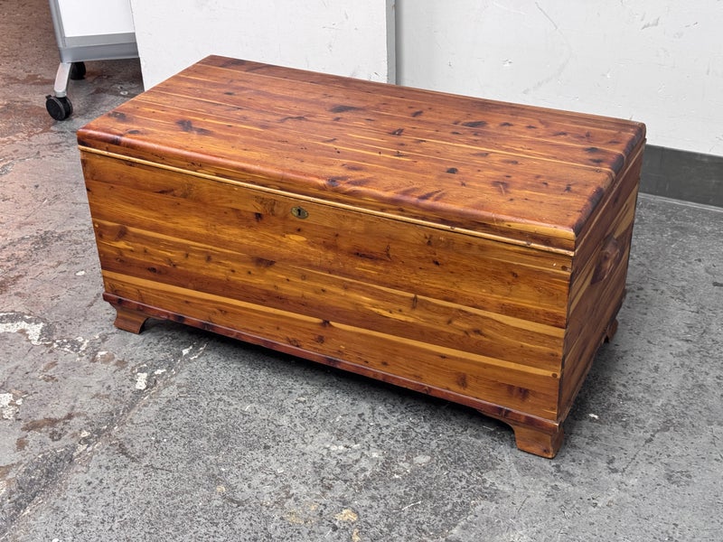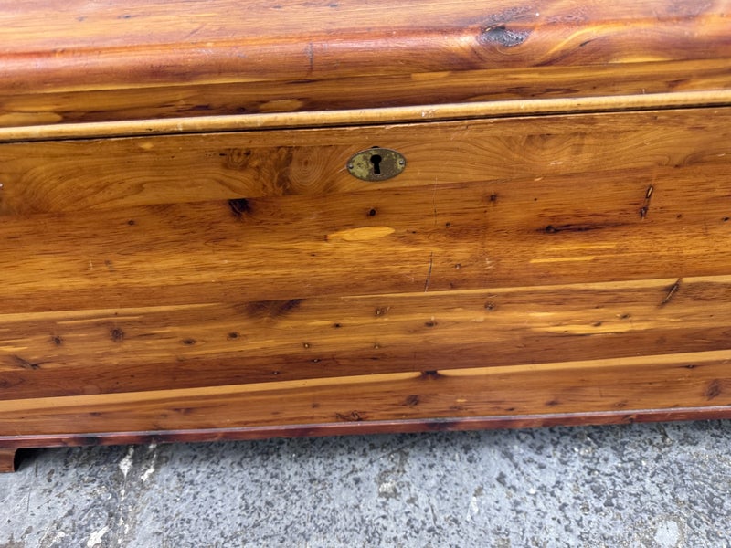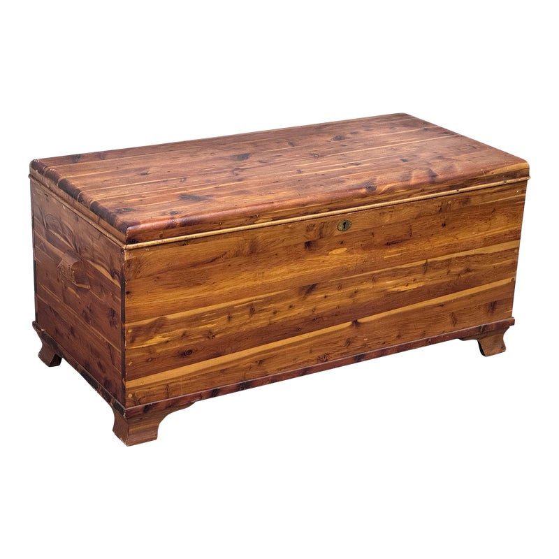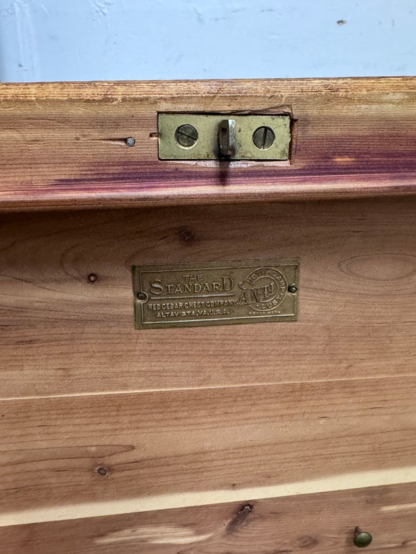Design Plus Gallery presents a Cedar Blanket Chest The Standard Furniture. The top lifts on two hinges.. Sits upon raised feet to protect from damage. Is in good condition with visible distress and minimal signs of wear for its vintage age. Does not come with key. Made in USA.