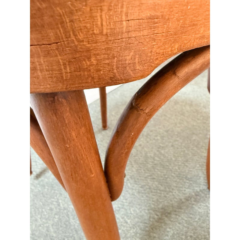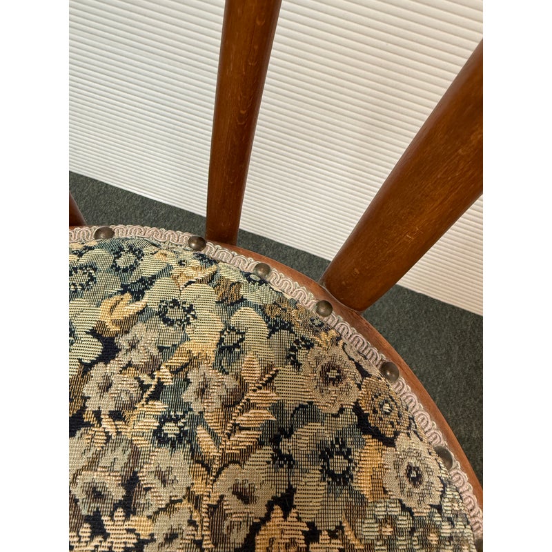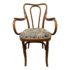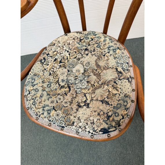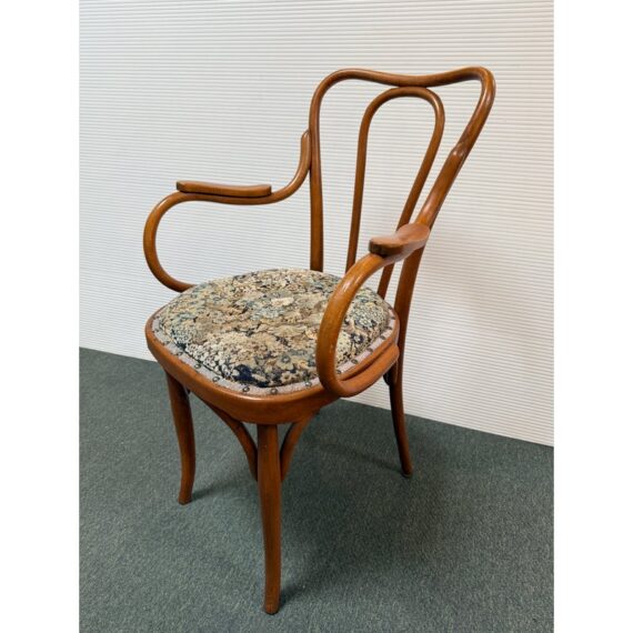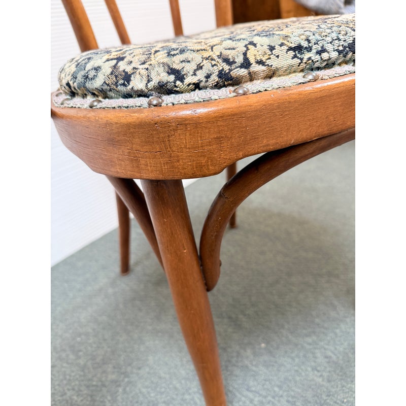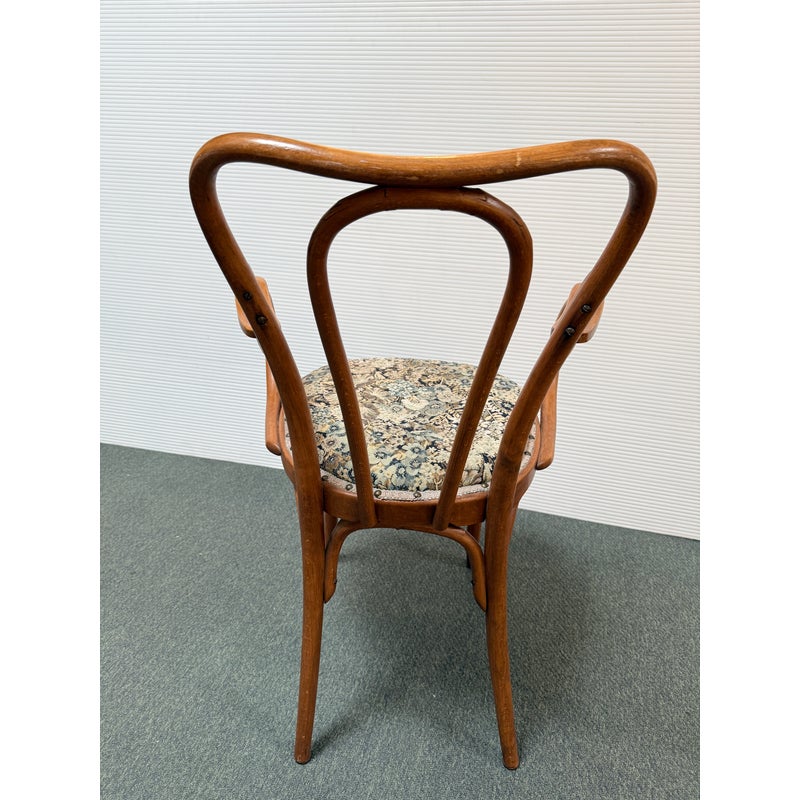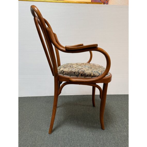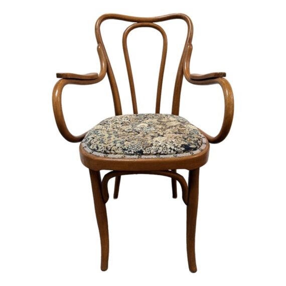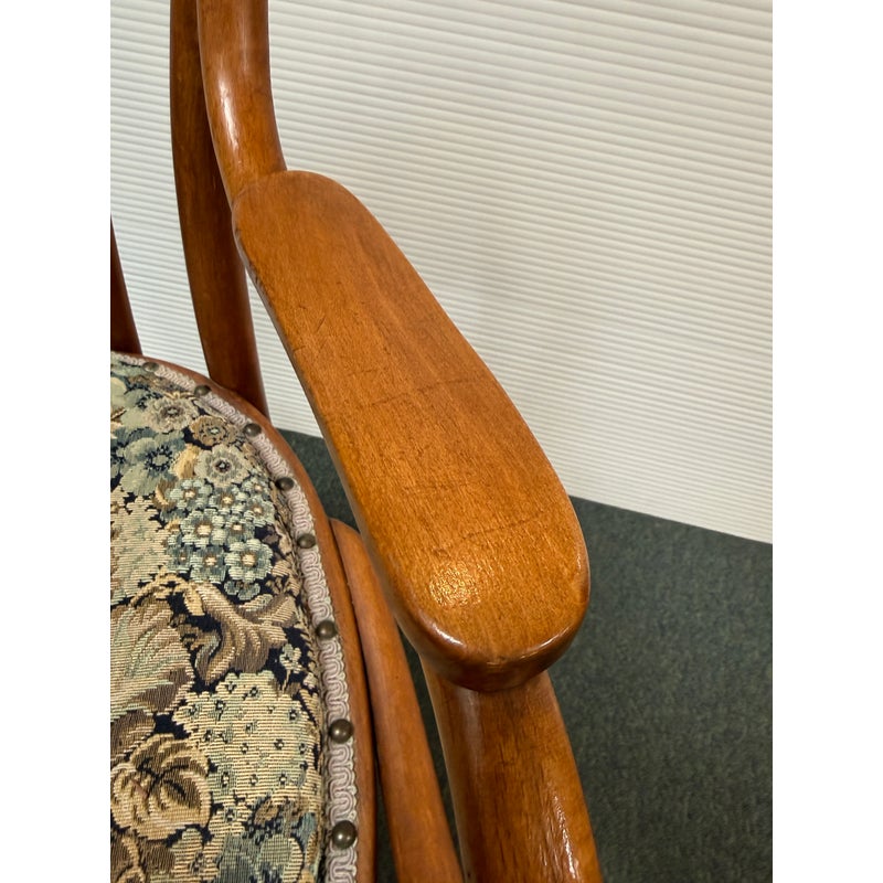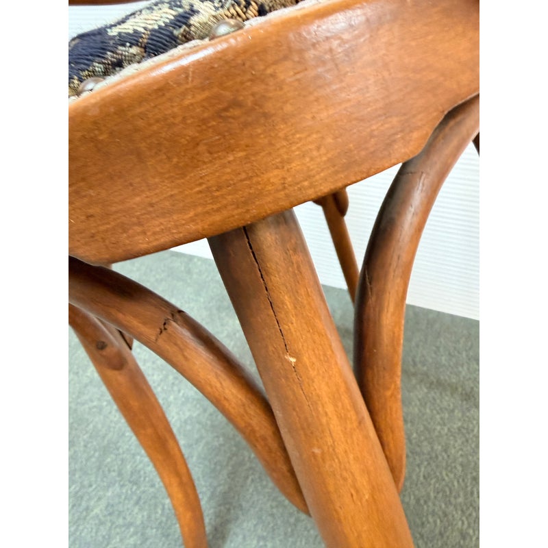 Design Plus Gallery presents a Vintage Thonet Style Bentwood Chair. Voluptuous Belle Epoch curves in a warm finish, with arm rests for comfort. Deeply cushioned and upholstered with tapestry fabric in a floral motif. Stamped “19” on underside. Some cracks expected with age; condition is fair for age and use.