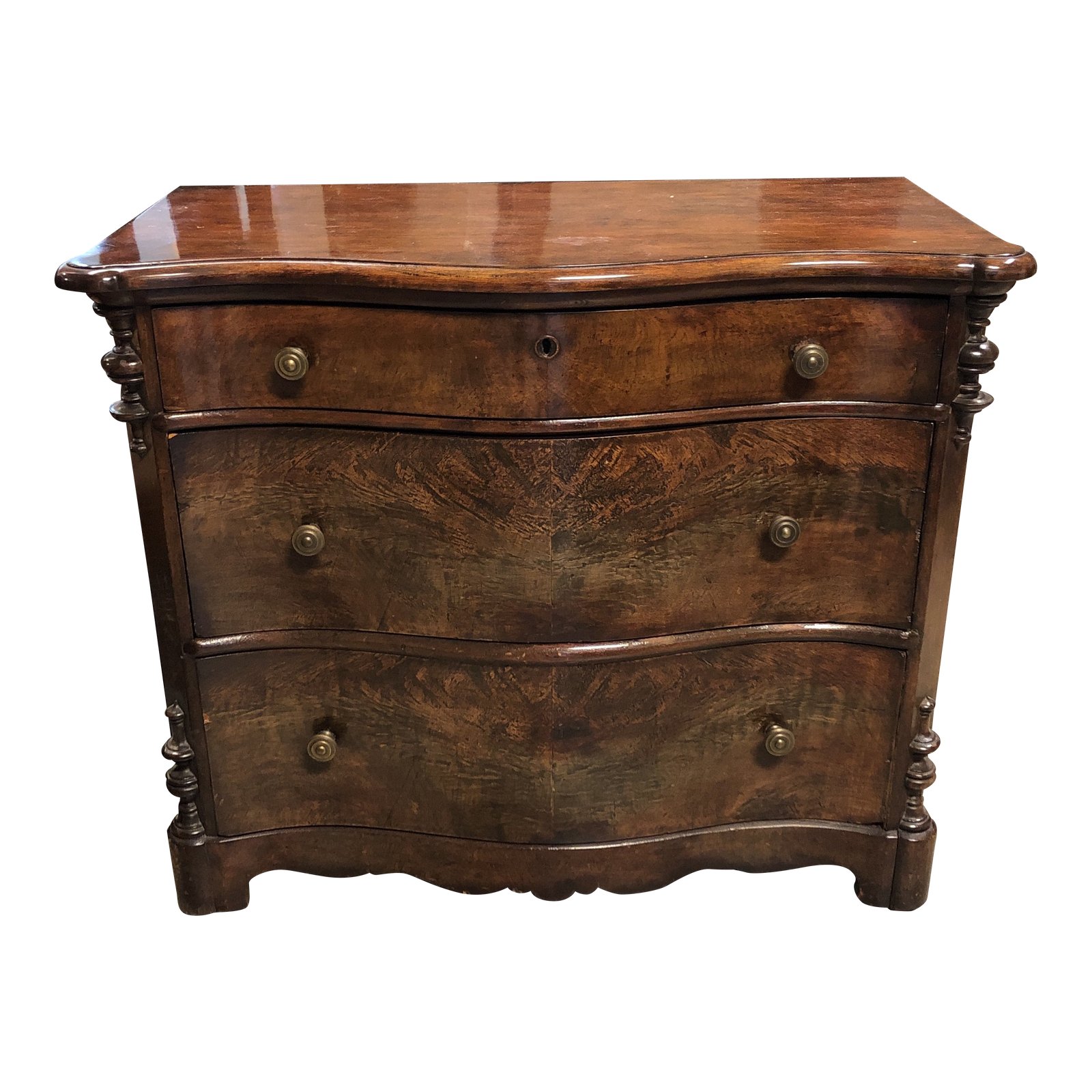 Design Plus Gallery presents a vintage dresser. Crafted with solid woods by skilled craftsman. Three pullout drawers with brass metal pulls knobs. Visible natural distressing with age. Small in size, can fit in any space.