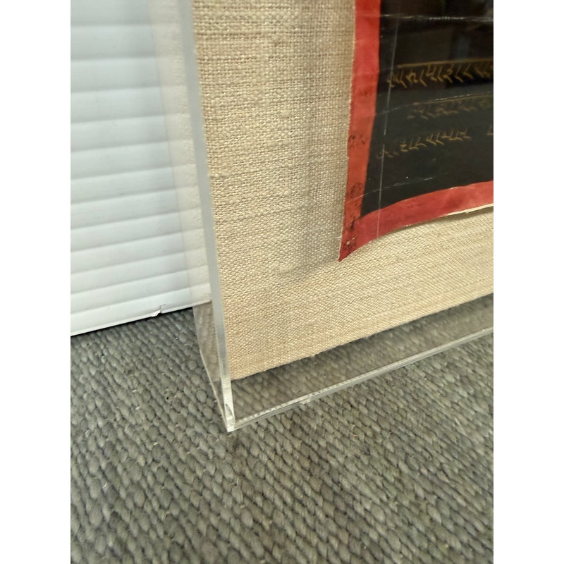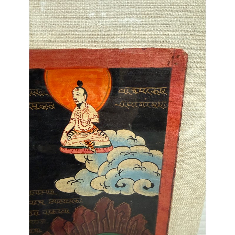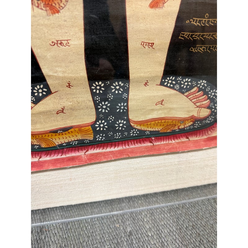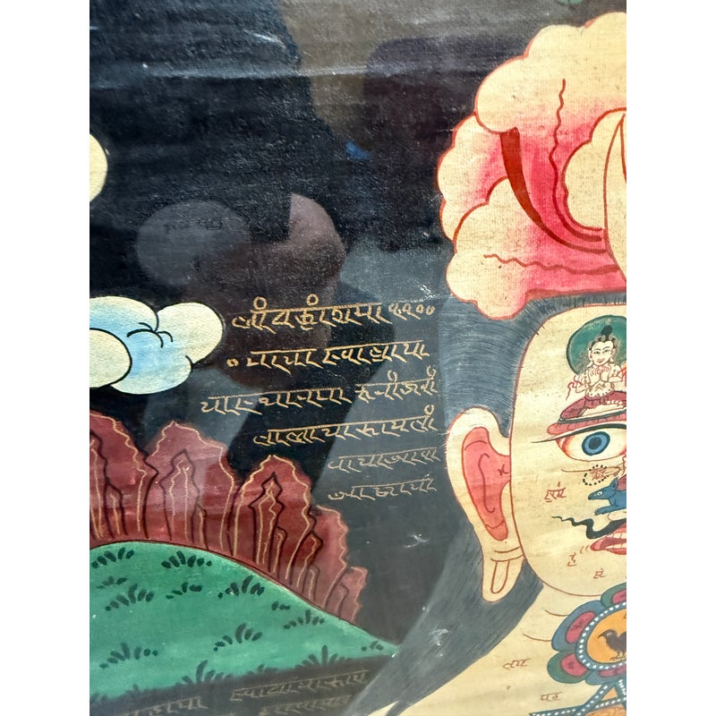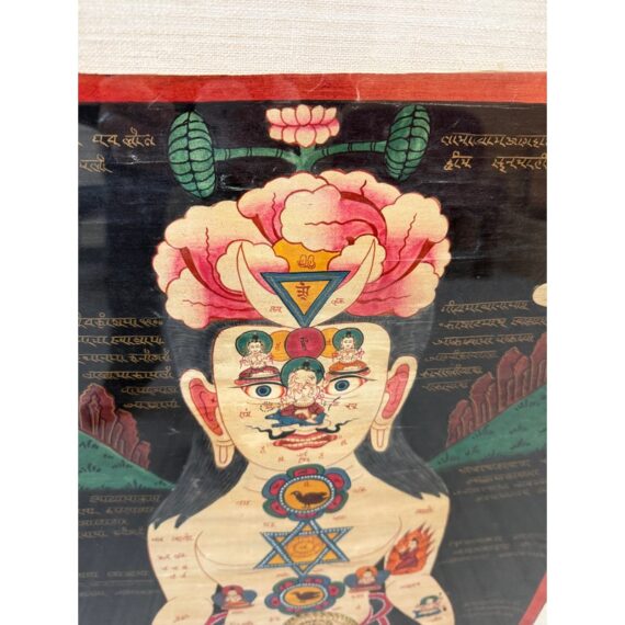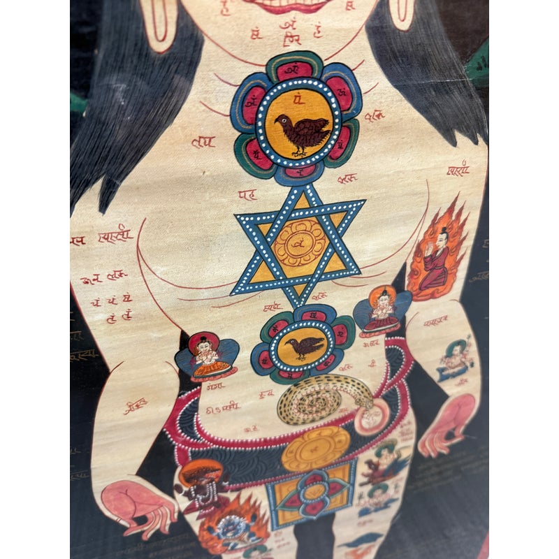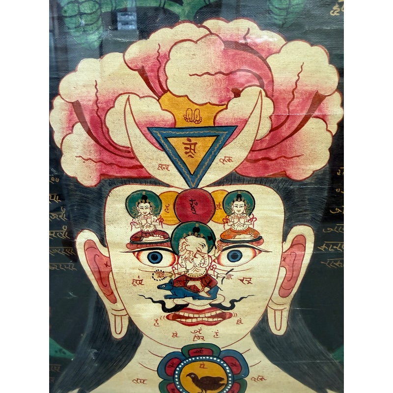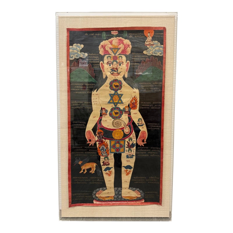 Design Plus Gallery presents a Vintage Tibetan Thangka Painting. The colorful figure, overlaid with the seven Chakra points of the human body, is used to connect one spiritually to different realms and higher consciousness. The depiction makes for a wonderful meditation focal point, handprinted using natural minerals on a a cotton canvas. Professionally mounted and protected in Acrylic with wire for installation. Made in Tibet. Little wear, condition is good.