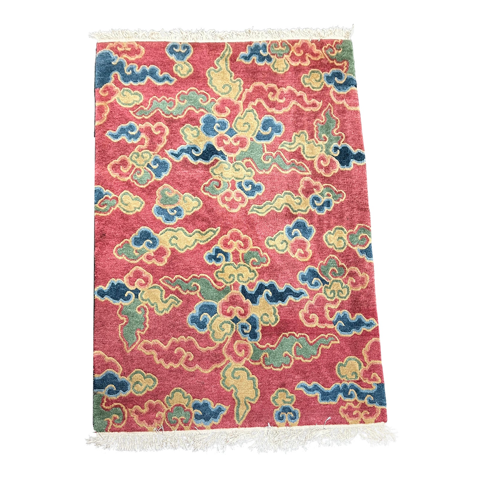 Design Plus Gallery presents a 4ft1in × 6ft6in Prosperity Cloud Area Rug. The small scaled floor covering makes an impact with rich hues of blue green and gold against a soft raspberry ground and graphic traditional design. Off white fringe complements the rug. Light evidence of wear; overall good condition.