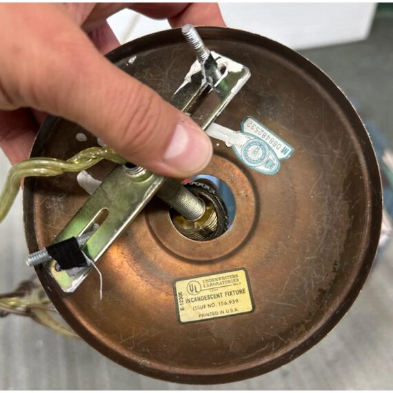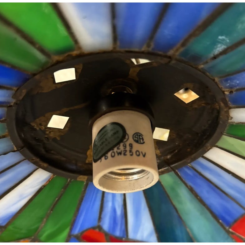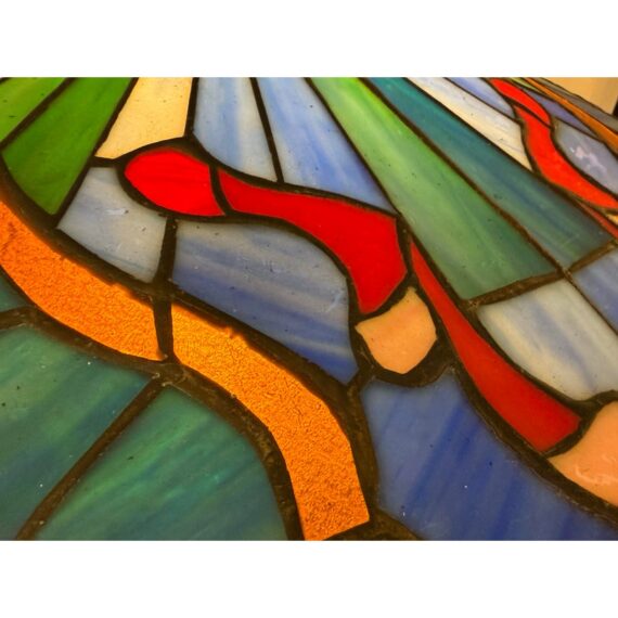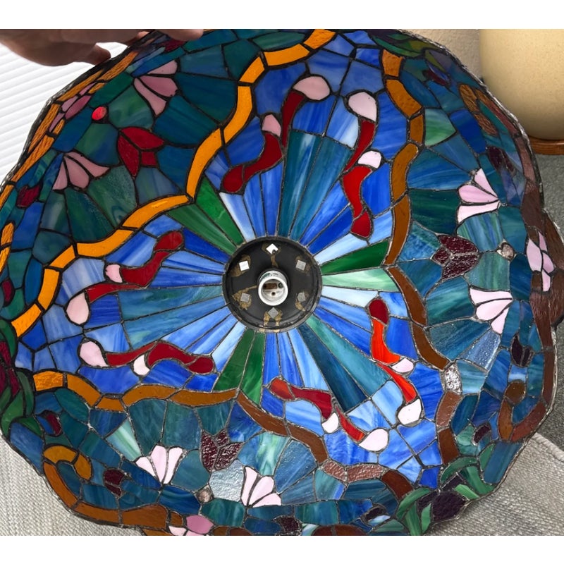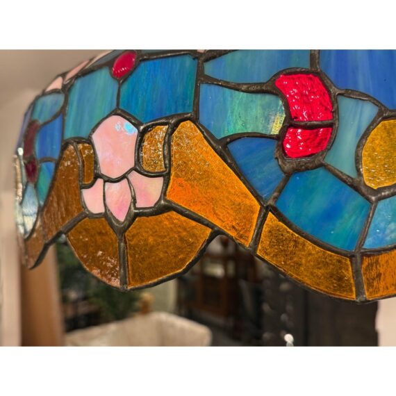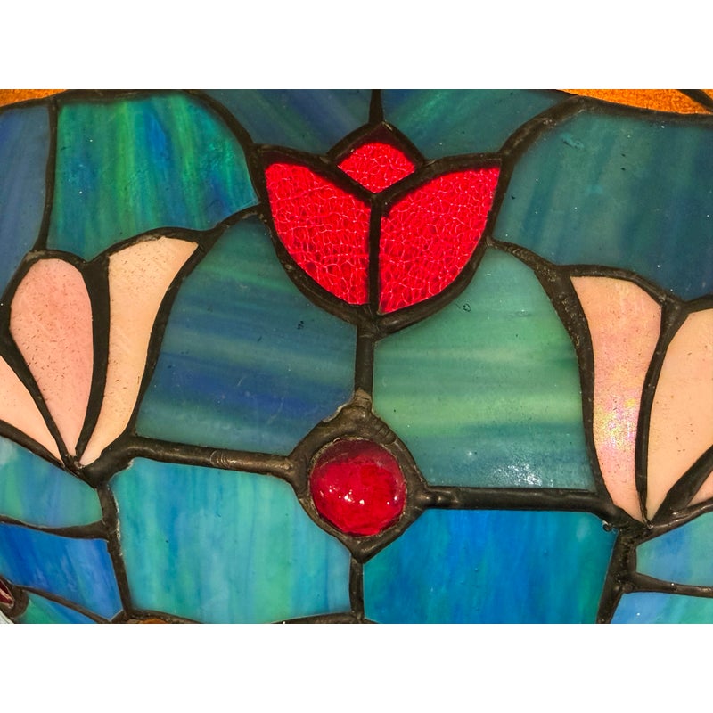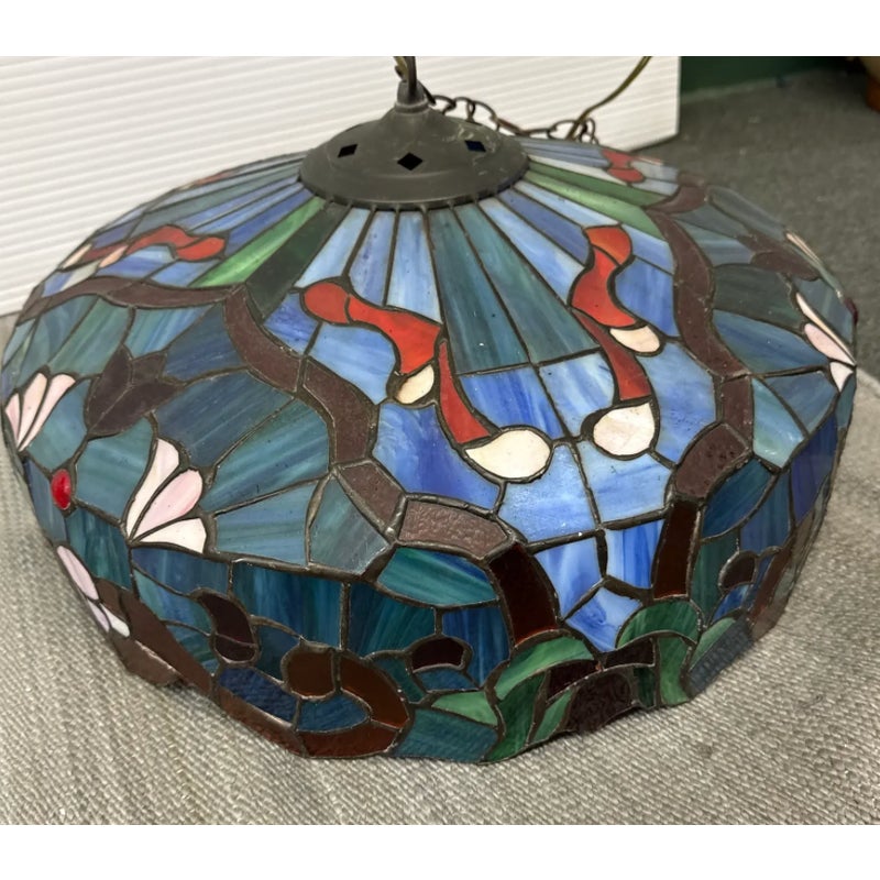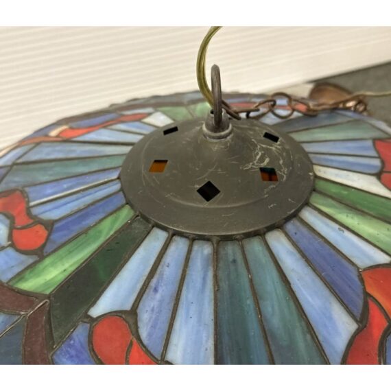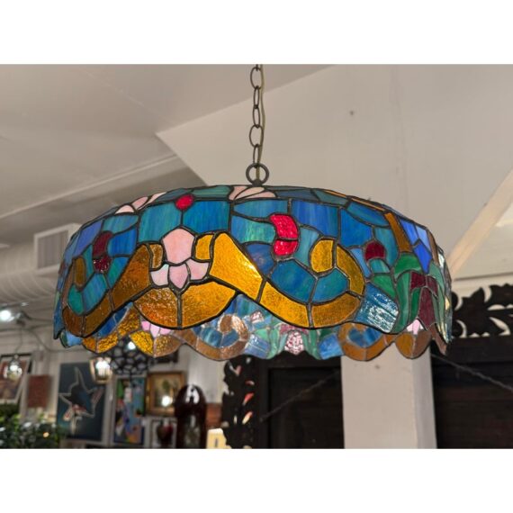 Design Plus Gallery presents a Stained Glass Hanging Pendant of Vintage Age and Tiffany Style. Transform your home with a simple switch of a light fixture to the mid 20th century. This light will bring a relic in and keep your well lit with its stained glass colors bouncing off your walls. Primarily colored in blues, with splashes of red, white and green to give your room a nautical feel. The pendant shows signs of wear that are consistent with its vintage age and in fair condition for its usage.