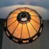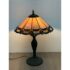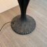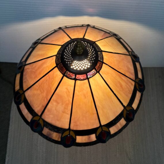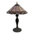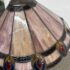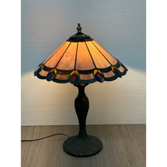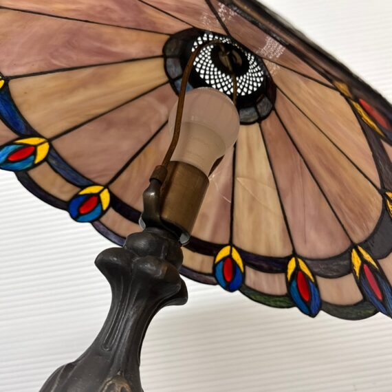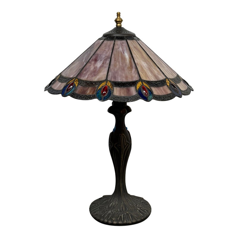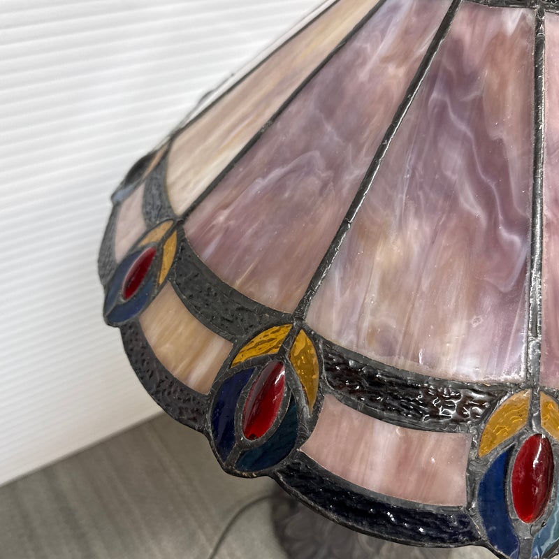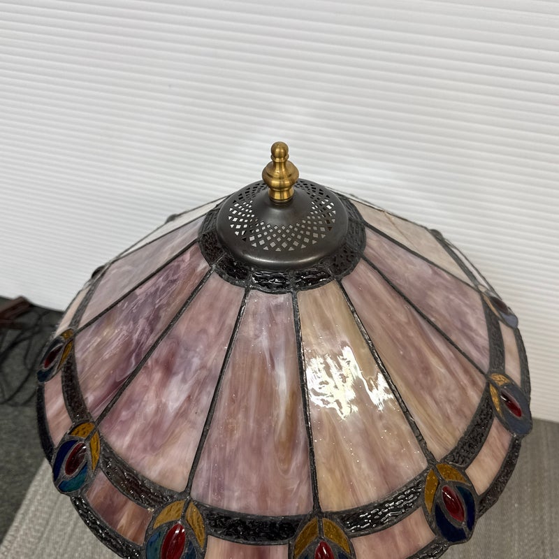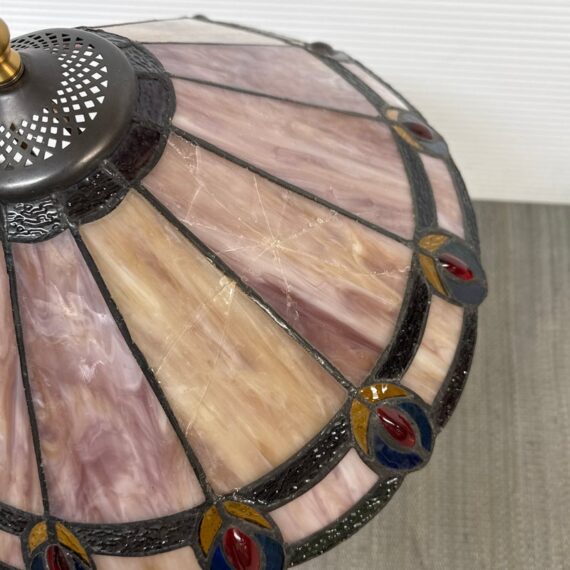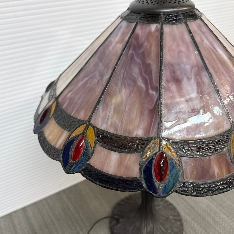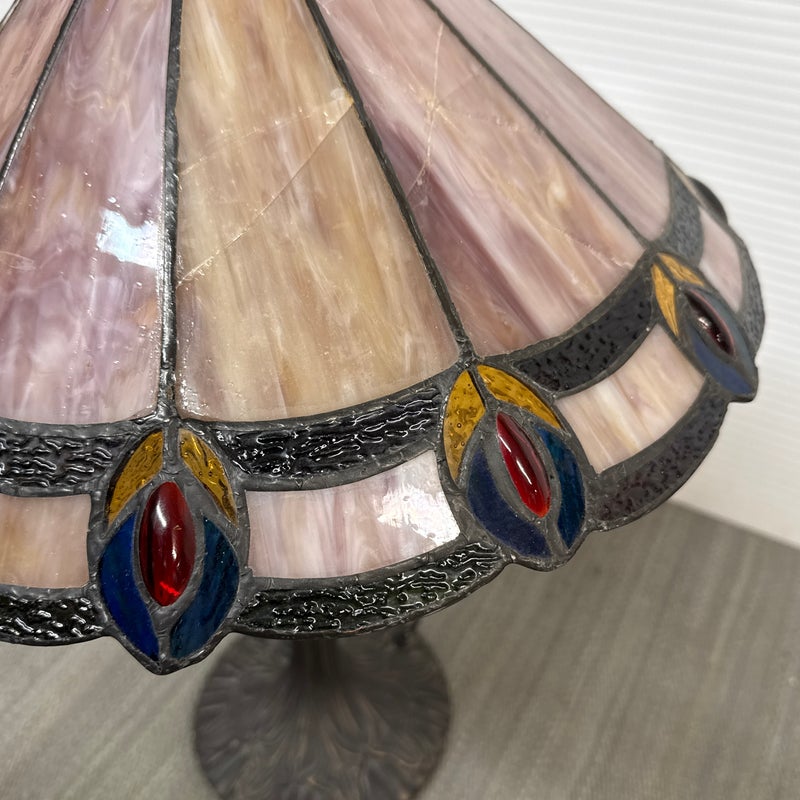 Design Plus Gallery presents a Tiffany Style Table Lamp. In the tradition of Louis Tiffany, this leaded shade is a burst of color and light. The cone shaped shade is paneled with swirling mauve panels that end in bright “feathers”. Intricately cast base supports the glass shade. Visible crack in two panels; condition is fair for age and use.