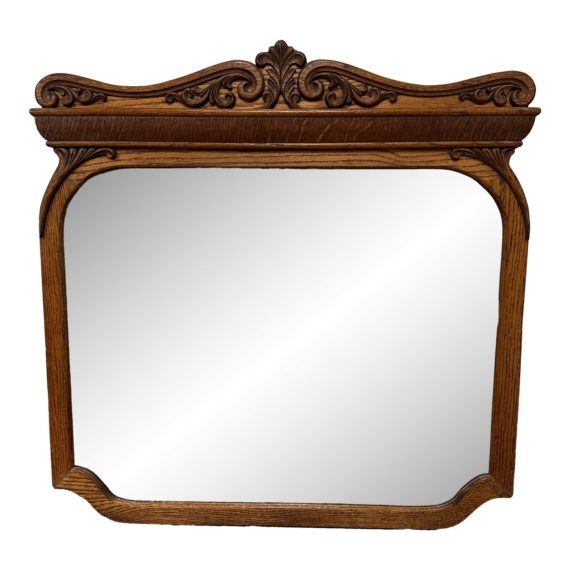 Design Plus Gallery presents a Carved Tiger Oak Wood Vintage Wall Mirror. A vintage carved tiger oak wall mirror is a stunning piece of decor that showcases the beauty and craftsmanship of solid oak wood. The mirror frame is intricately carved with detailed designs, adding an elegant and timeless touch to any space. The rich, warm tones of the tiger oak wood create a sense of warmth and character, making it a focal point in any room. In good condition for its vintage age + use.