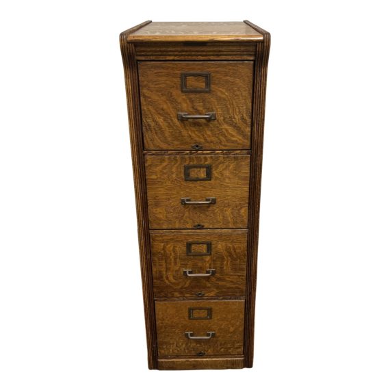 Design Plus Gallery presents a good quality filing cabinet. Of panelled construction in beautifully figured tiger oak, it features its original cooper pull handles and card holders. Very stylish piece, the cabinet is in good order, the drawers are easy to open and slide out on the metal rollers.