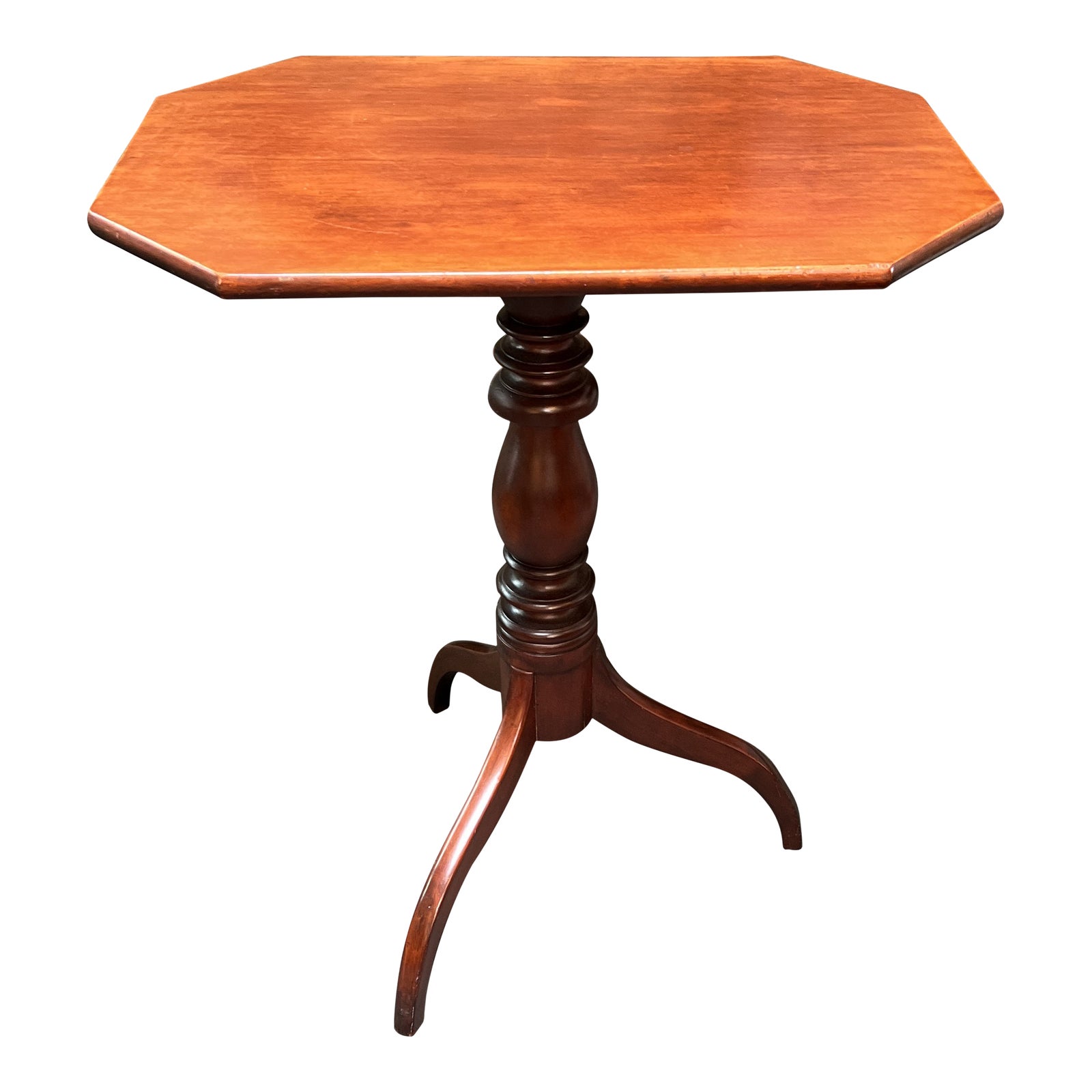 Design Plus Gallery presents a Vintage Tilt Top Table. Constructed with wood. The table top is octagonal with one extended end. A trapezoidal piece rotates to secure the top when in use. The base is a pedestal with three legs and turned post accents. Minor wear consistent with age + use; table is in good condition.