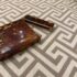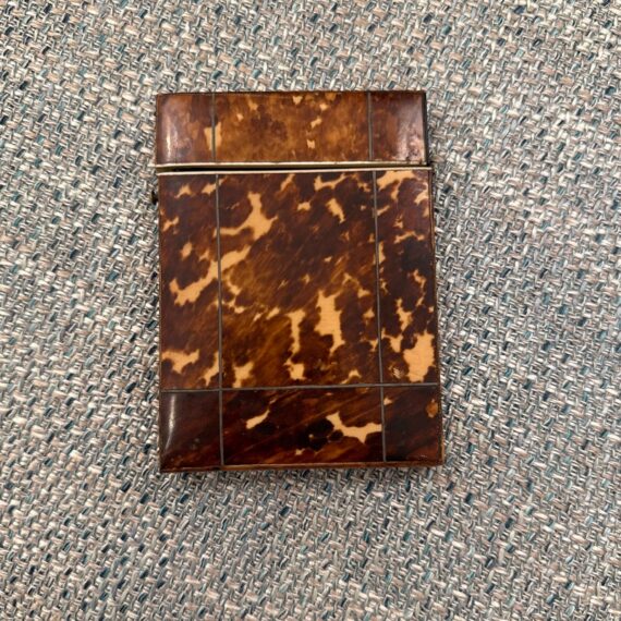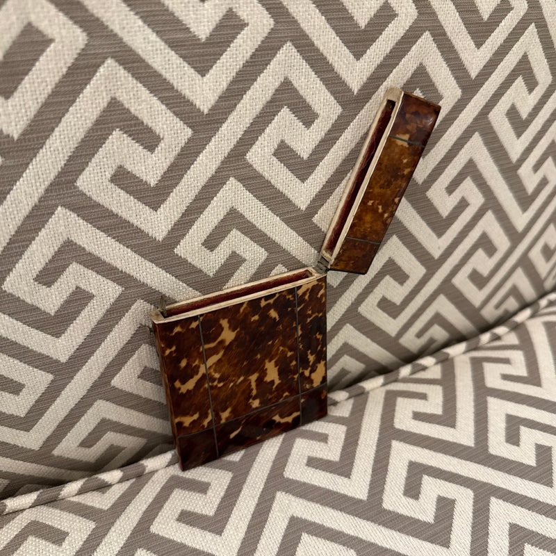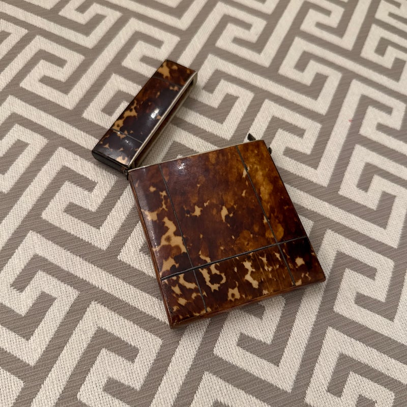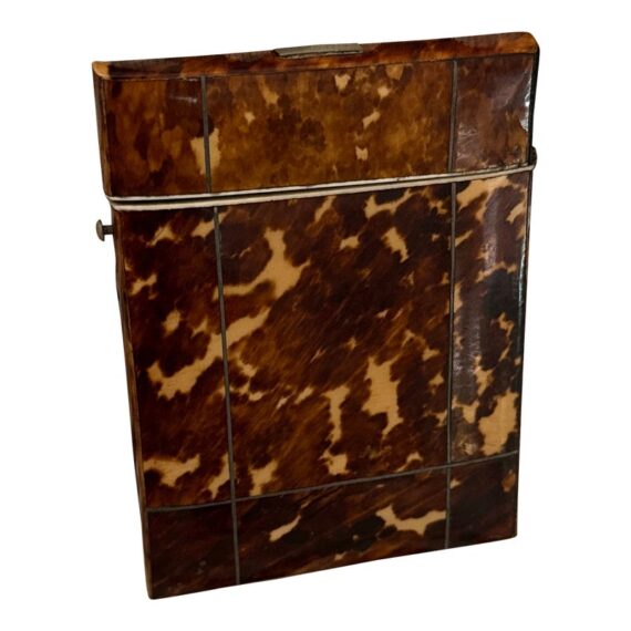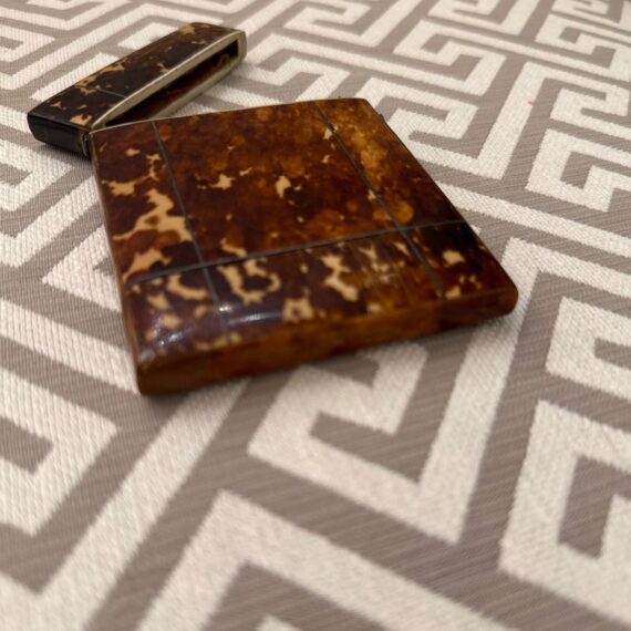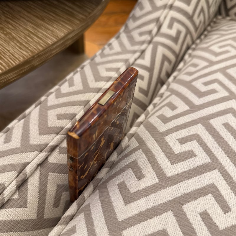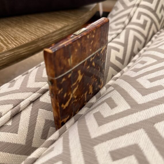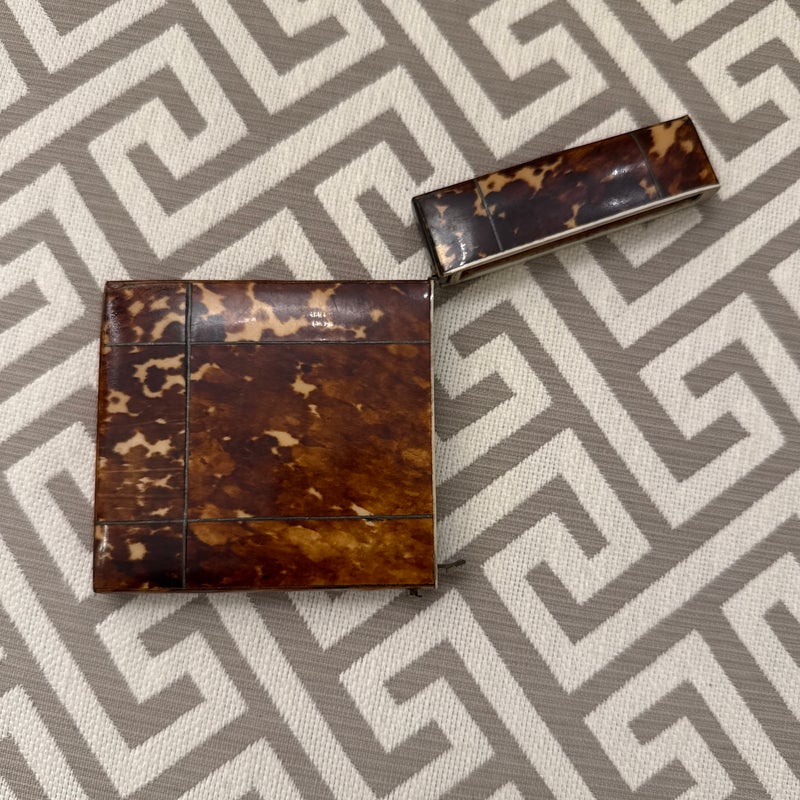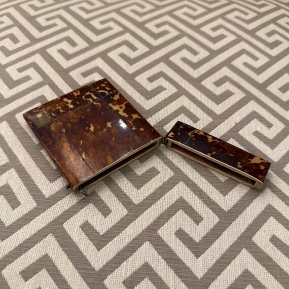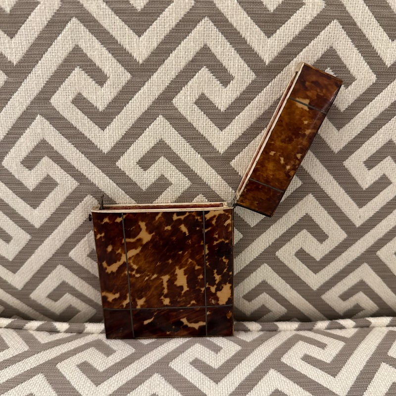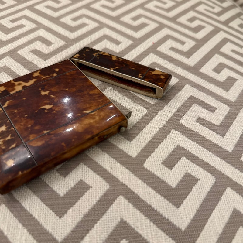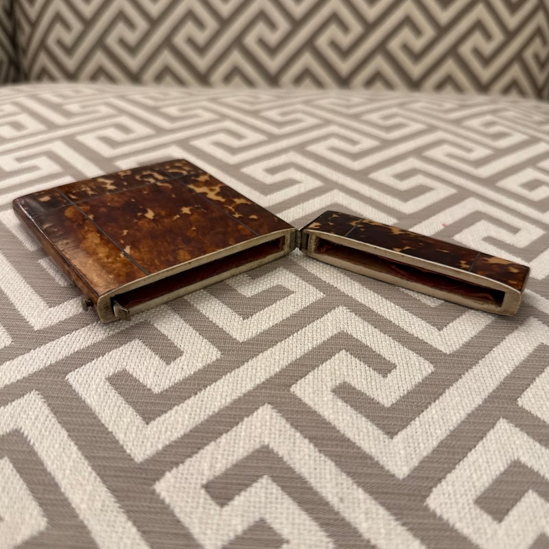 Design Plus Gallery presents a Vintage Cigarette Holder with a Tortoiseshell Design. Possibly an antique and has brass that shows patina with its age. The brass encases the holder around the hinge and seam, allowing the holder to open from the top fifth and opens wide. The piece shows signs of wear that are consistent with regular use and considerable age.