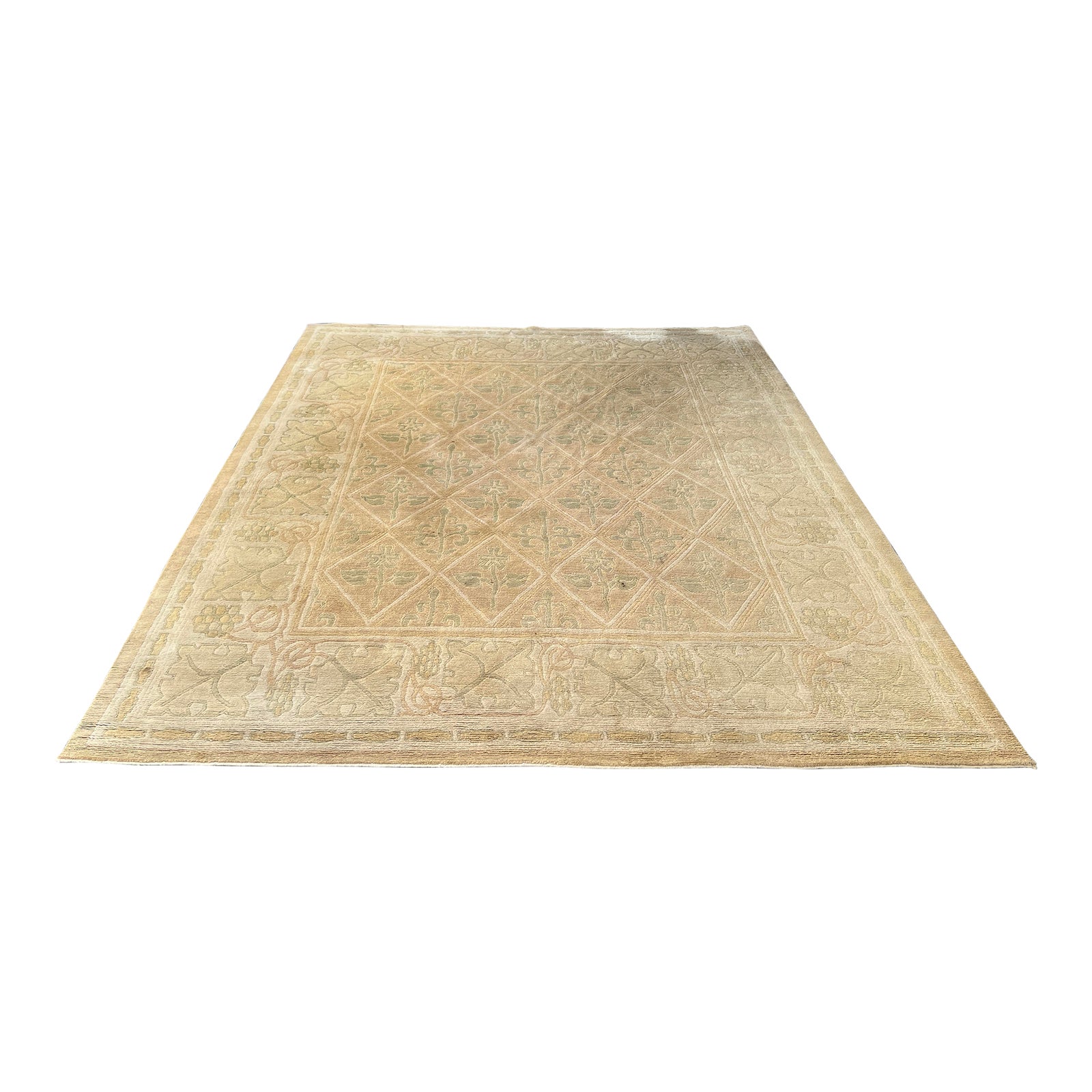 Design Plus Gallery presents a 8ft by 10ft2in Turkish Wool Neutral Rug. Constructed with wool in a primarily tan shade. The field is dominated by a diamond pattern. The diamonds are filled with botanical accents like the borders surrounding it. Some sun damage and small stains. Visible + minor wear from age + use; rug is in good condition.