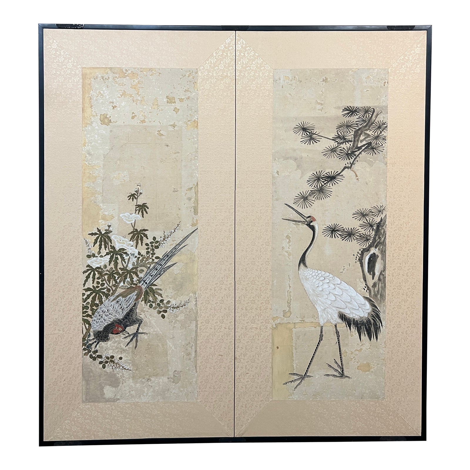 Vintage Two Panel Japanese Screen With Cranes
