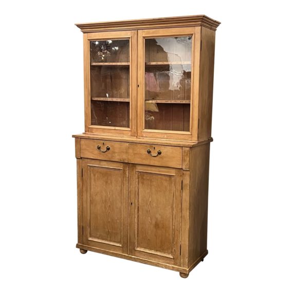 Design Plus Gallery presents a Vintage Pine Hutch With Glass Doors. This beautiful pine hutch that is sure to bring a little country chic to your home. It features two lower drawers and glass cupboard doors that open to reveal ample storage space. This piece has a rustic look that will give your home a warm and inviting feel.Whether you’re looking to store your dishes, linens, or knick-knacks, this hutch is the perfect choice. Locking mechanism is present, does not come with key.. In good vintage condition, wear consistent with age + use.