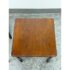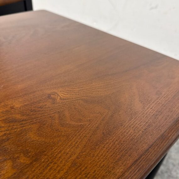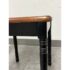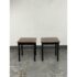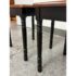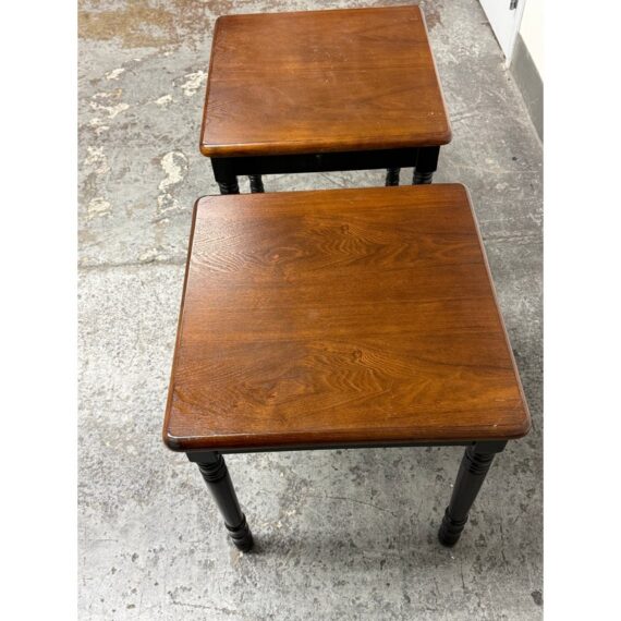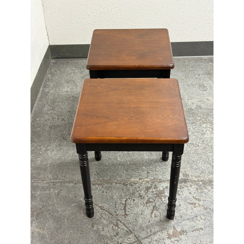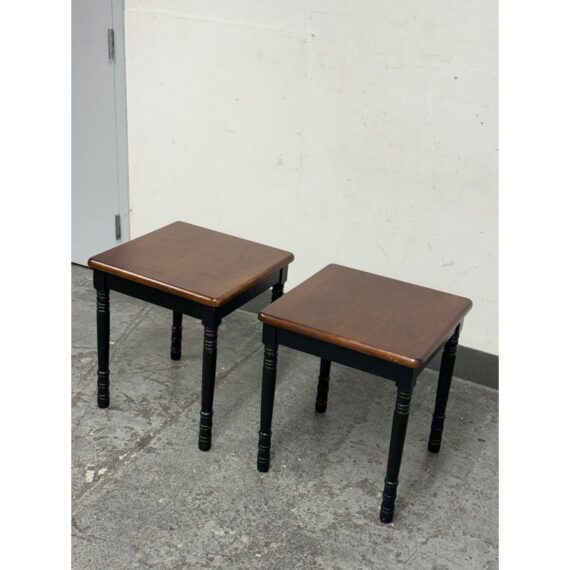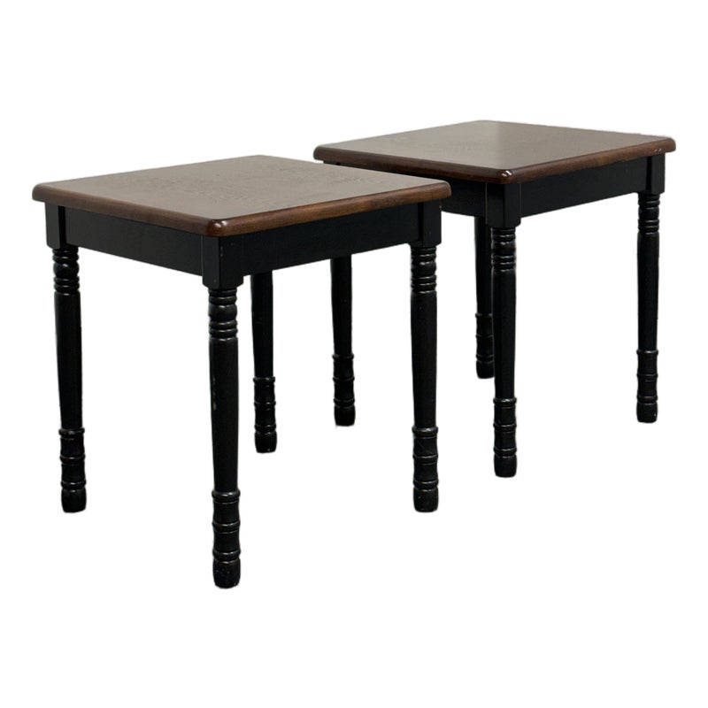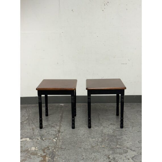 Design Plus Gallery presents a Pair of Two Tone Side Tables. Each table offers a square top in a medium brown wood tone set above a black painted base with turned legs and a tailored profile. The pair shows balanced proportions and a classic mixed-finish look with rounded corners and a straightforward silhouette. They are in good condition with visible scratches and minimal markings from usage.