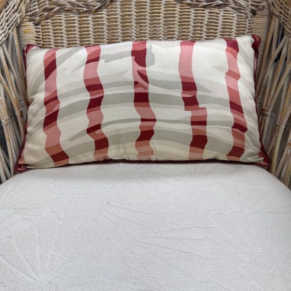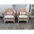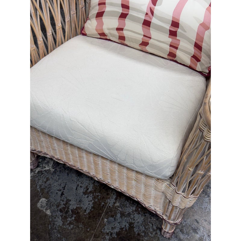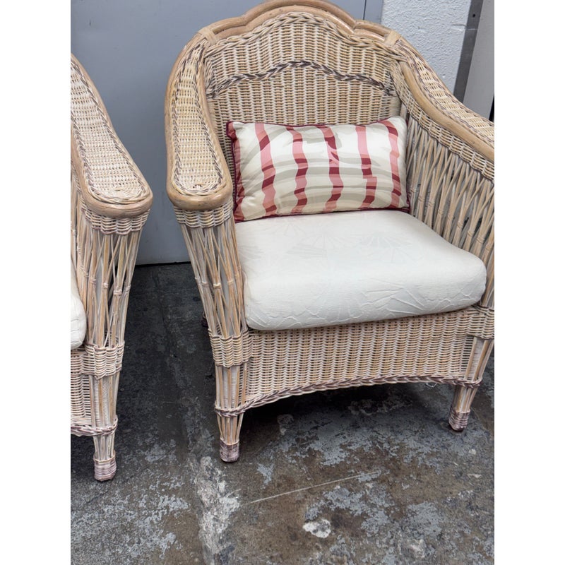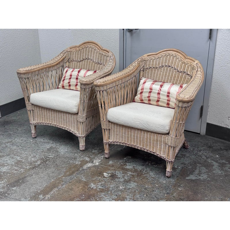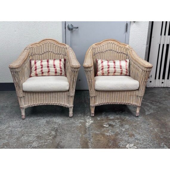 Design Plus Gallery presents a Pair of Outdoor Lounge Chairs from Typhoon International Corporation. The pair are identical and from the late 20th century, now a rare find. They were hand made by skilled craftsman in the Philippines and imported by Typhoon. They are woven tan with touches of pink that may have been from painted finish decades ago. They each have a white seat cushion and red/white lumbar pillow. Other than the light pink on the finish the chairs are in good condition for their vintage usage. Made in the Philippines.