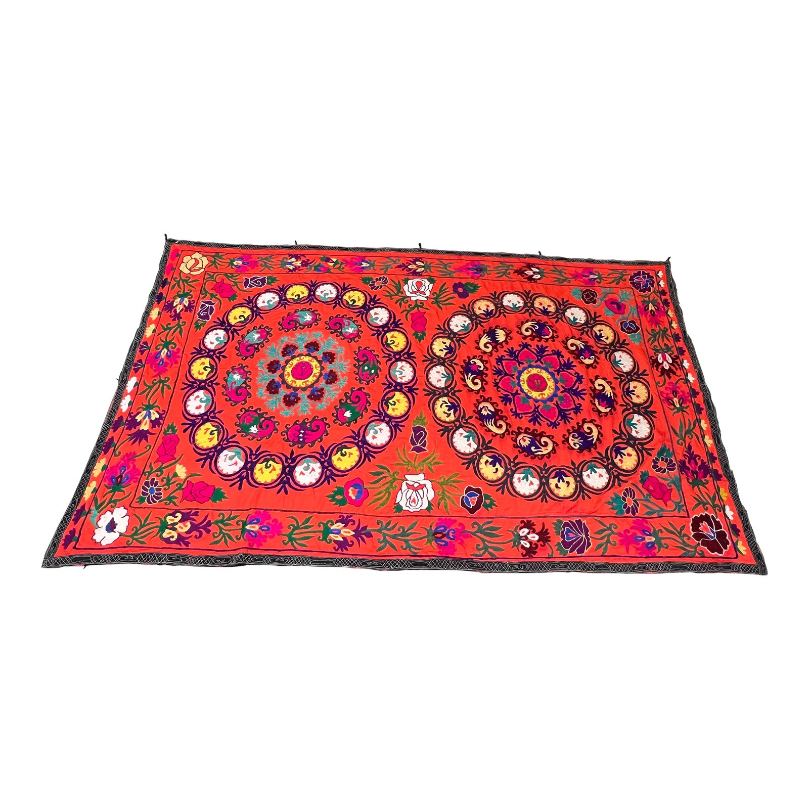 Vintage Uzbekistan Double Medallion Yellow on Orange Cotton+Cotton Suzani