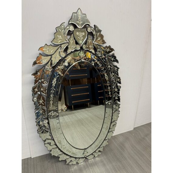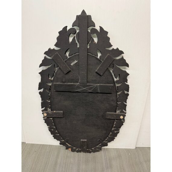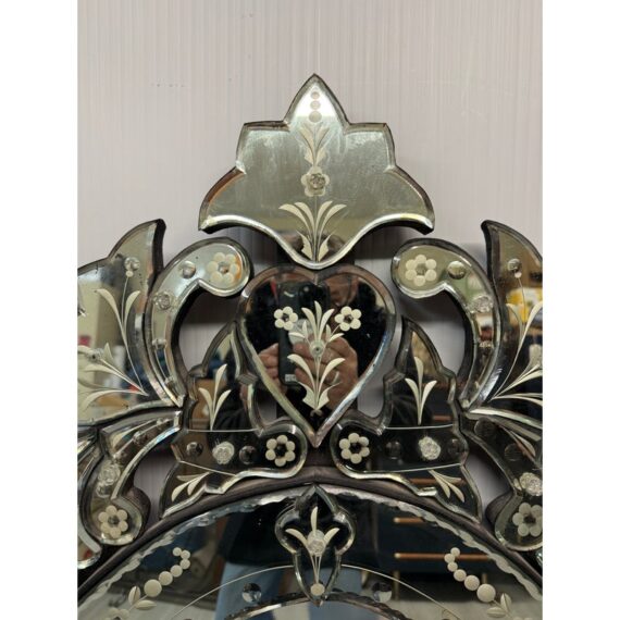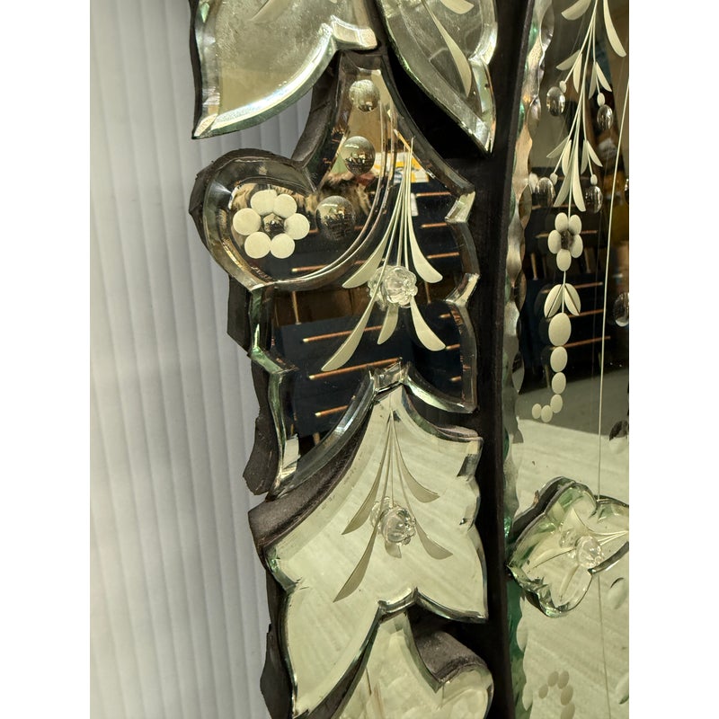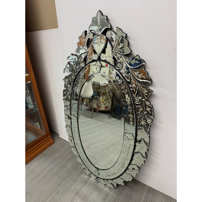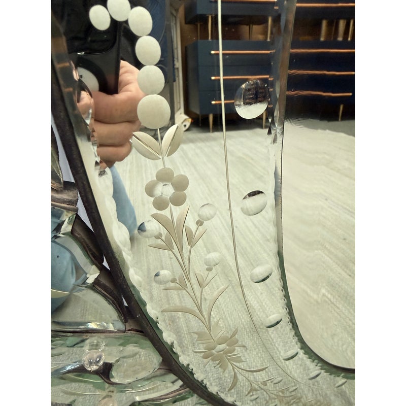Design Plus Gallery presents a Vintage Venetian Style Wall Mirror. Featuring all the charm of the 16th and 17th Centuries, this elegant mirror is hand-etched, cut and beveled, with rosette connectors. Wire hanger on back for ease of installation of the heavy mirror. Light wear; condition is good.