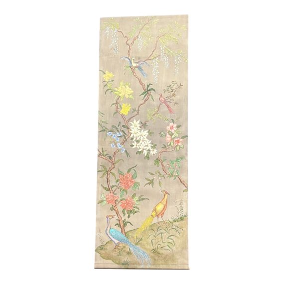 Design Plus Gallery presents an exquisite wall hanging in the style of 18th century Chinese wallpapers. This is in the style of grace with the scenic floral + exotic birds to display. The wall panel hanging will cover an area of W36″ x H106″