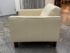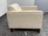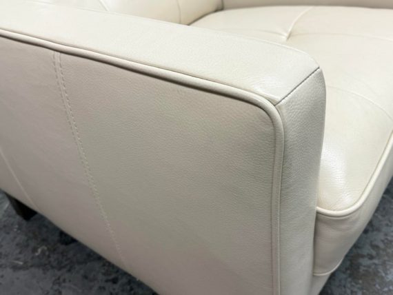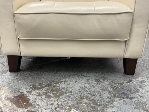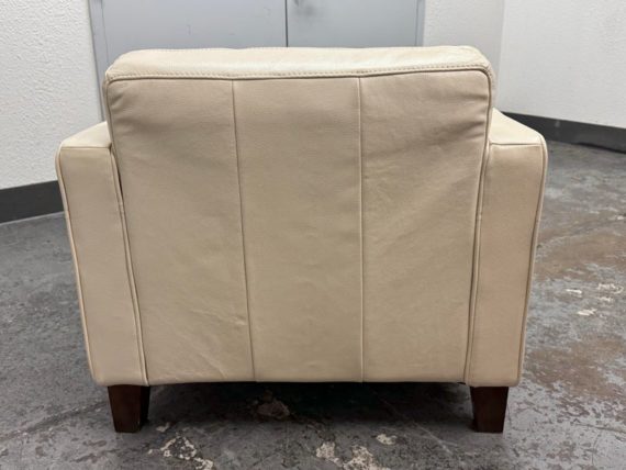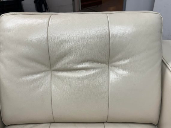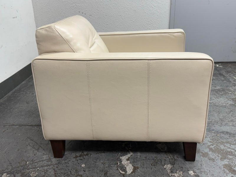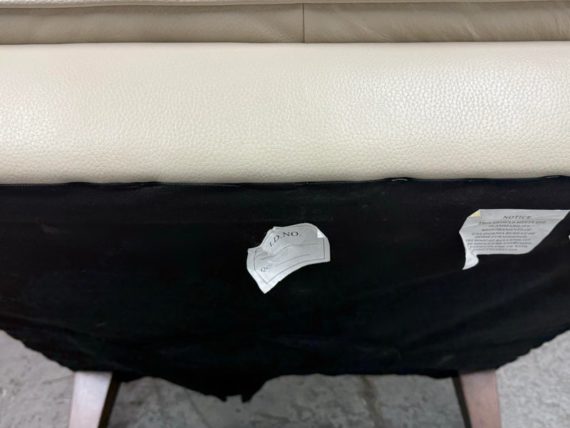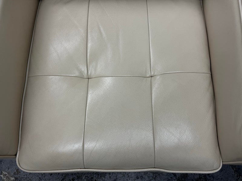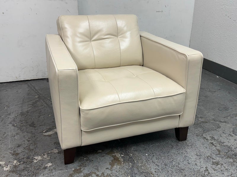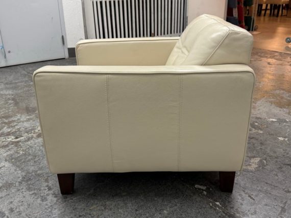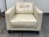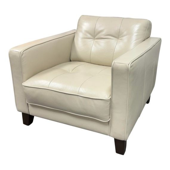 Design Plus Gallery presents a Vintage Lounge Chair.. A classic chair design with track arms, simple button tufts in an Ivory off-white leatherette. The vintage chairs shows visible surface wear and is in good condition overall. The dust cover underneath is torn.
