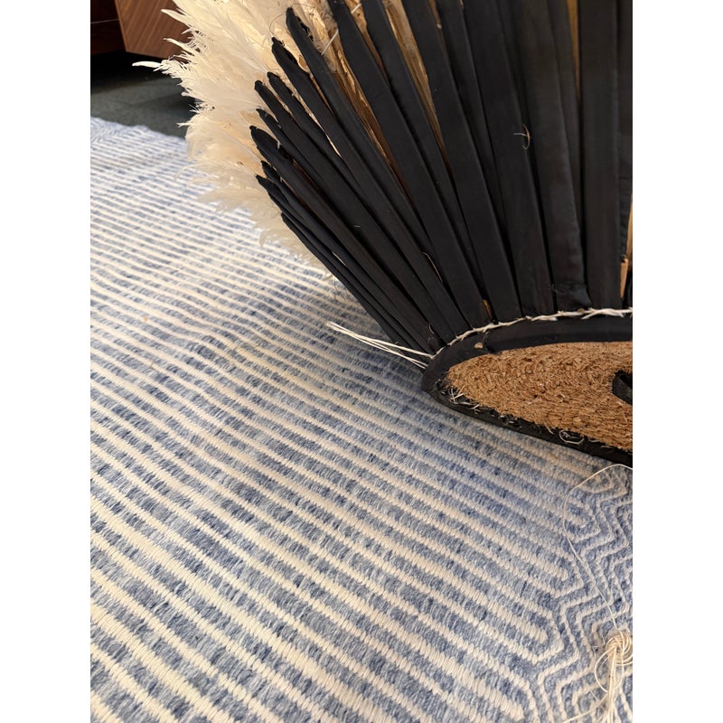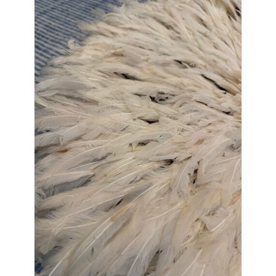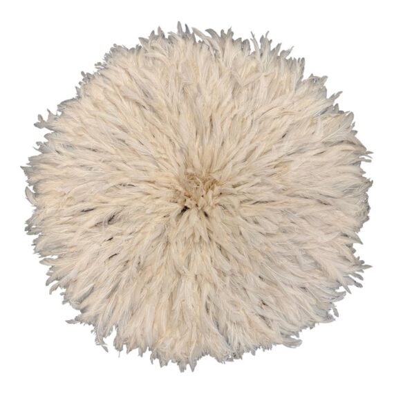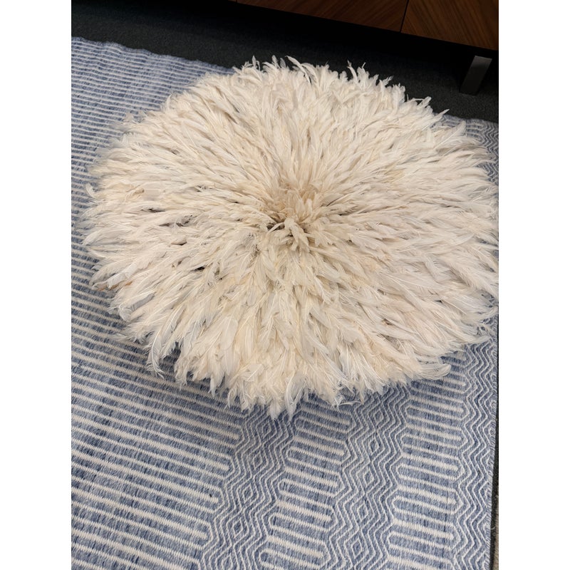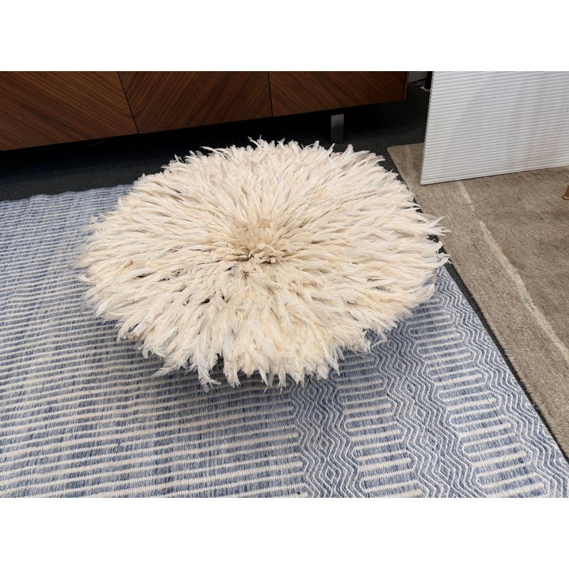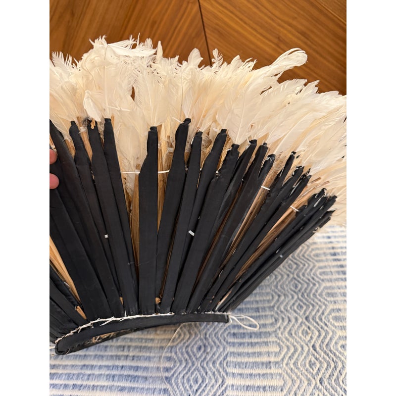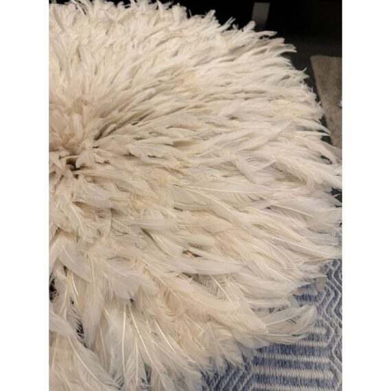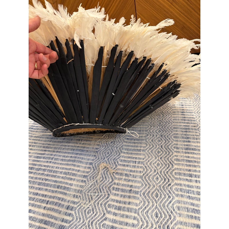 Design Plus Gallery presents a Vintage Juju Feather Hat. Handmade by artisans in Cameroon, this hat would be traditionally worn by village chiefs during celebrations as a symbol of status. The feathers are carefully hand sewn onto a raffia base, which spreads out into a dramatic circle. Feathers are associated with beauty and are a symbol of prosperity and wealth. This piece can be displayed on stand (not included) or hung on a wall. Condition is consistent with age and use.