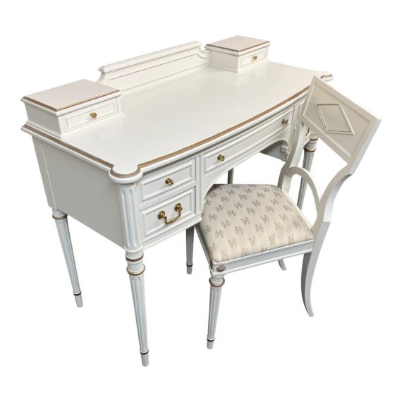 Design Plus Gallery presents a Vintage Desk or Vanity with matching chair. The lovely table is crafted of solid wood, finished in lovely white semi-gloss finish and detailed in gilt. Seven shallow drawers for storage and a spacious surface for work or display. Turned legs, paneled drawer front, column details and brass hardware all add to the vintage charm. Light evidence of wear; condition is consistent for age and use.