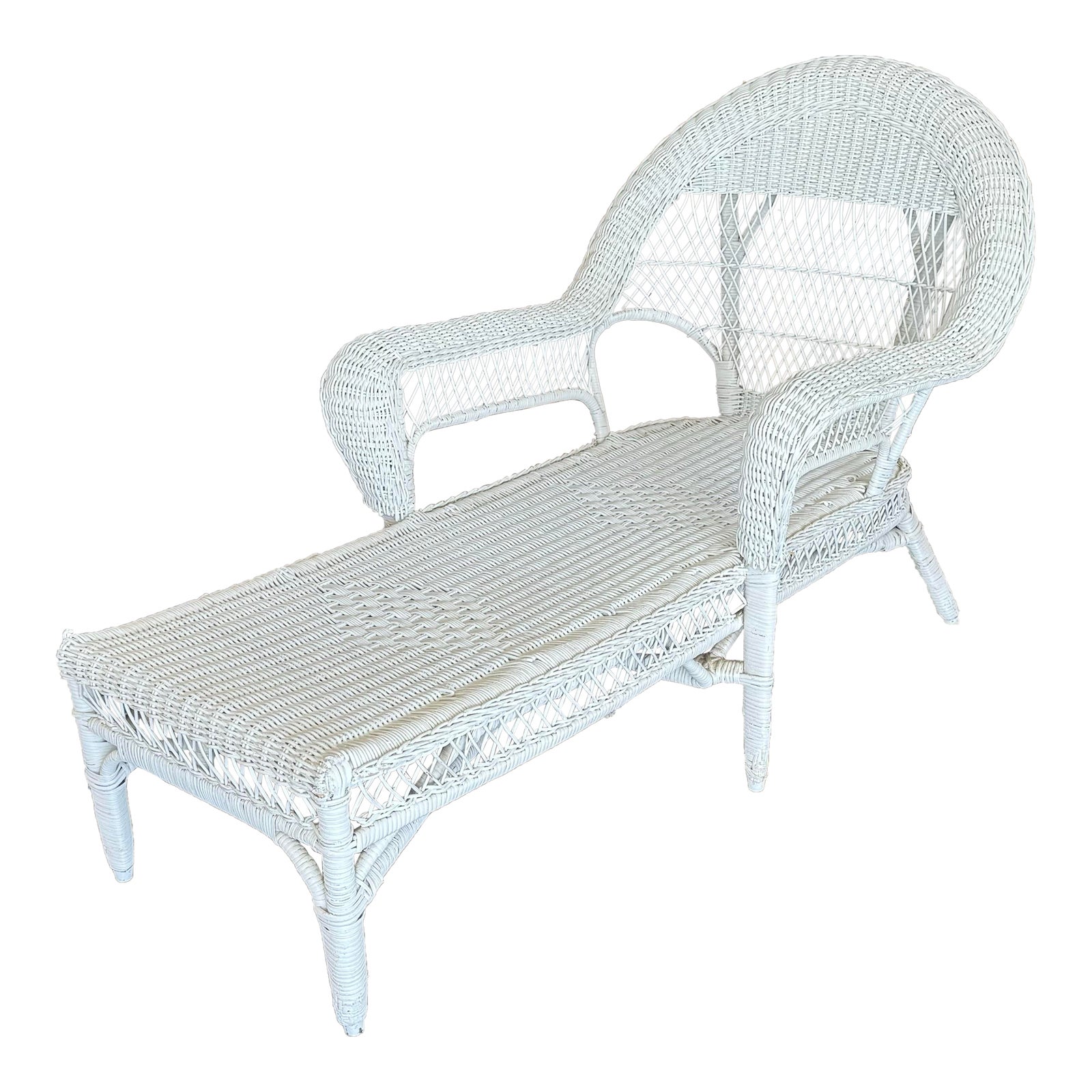 Design Plus Gallery presents a Vintage White Wicker Chaise Lounge. Exudes old-world charm and sophistication. The intricately woven white wicker frame is both durable and stylish, while the curved back and arms provide a comfortable and supportive lounging experience. Perfect for a vintage-inspired outdoor patio or a cozy reading nook, this chaise lounge adds a touch of elegance and relaxation to any space. Its shabby chic design creates a sense of nostalgia and warmth, making it the perfect piece to unwind and enjoy a lazy afternoon in style. In good condition, visible and minor wear form usage.