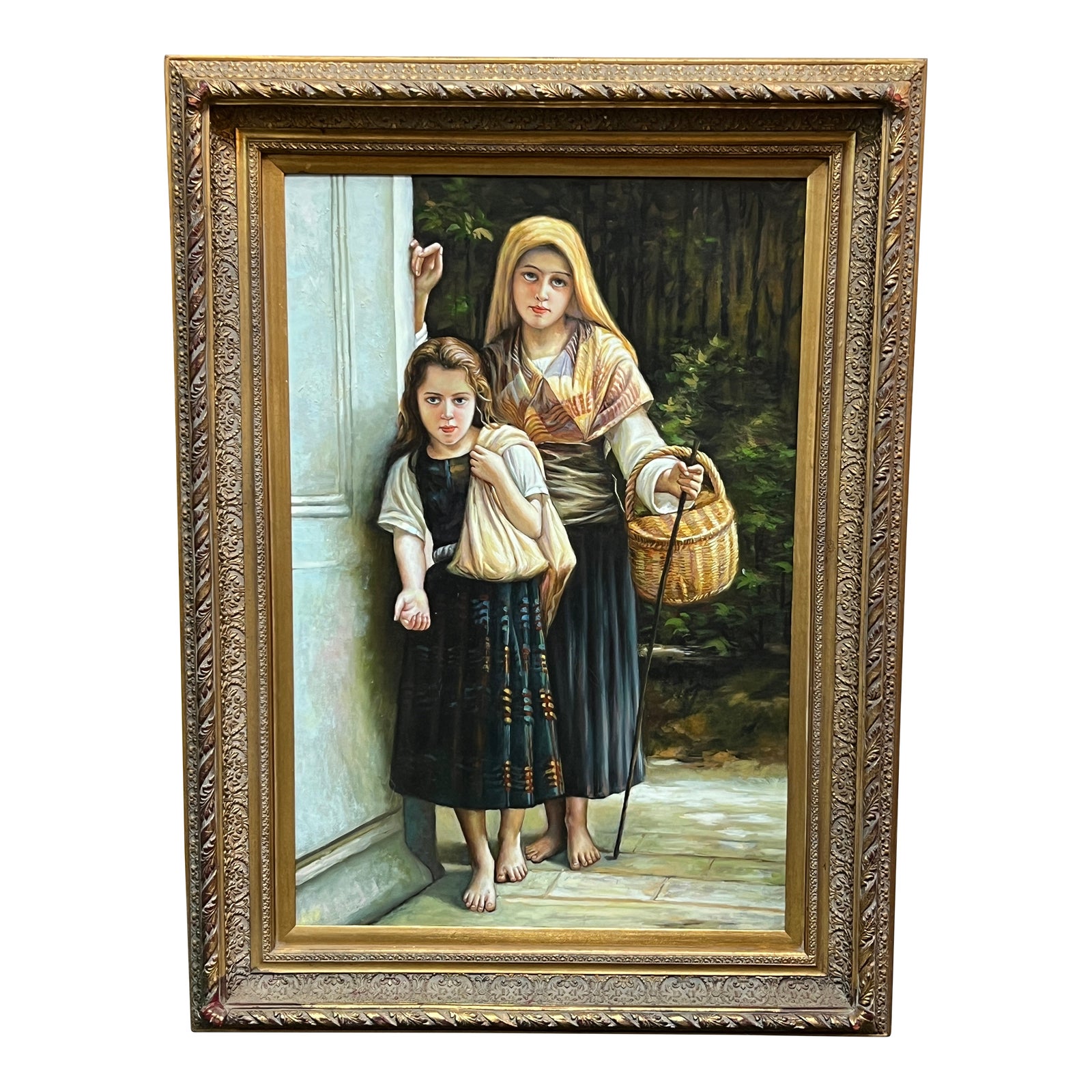 Design Plus Gallery presents a Vintage Custom Framed Painting. Original painting by French Artist William Adolphe Bouguereau (1825-1905). Depicts to sisters Young Sisters Begging. Minor wear from usage.