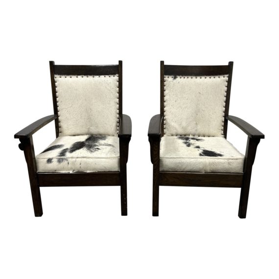 DesignPlus Gallery presents a Pair of Vintage Wood + Cowhide Arm Chairs. Dark wood stain contrasts beautifully with the spotted black + ivory hair on hide upholstery. Backs are slightly curved with arms for support. Minor wear through out, slight wobble, pair is in good condition.
