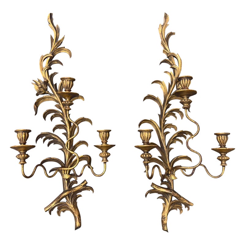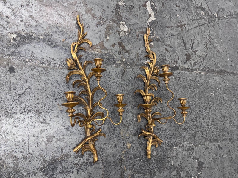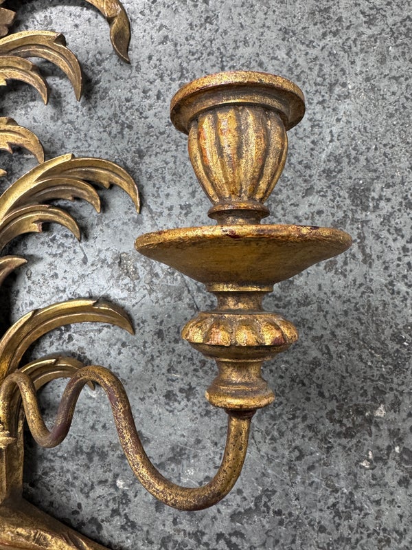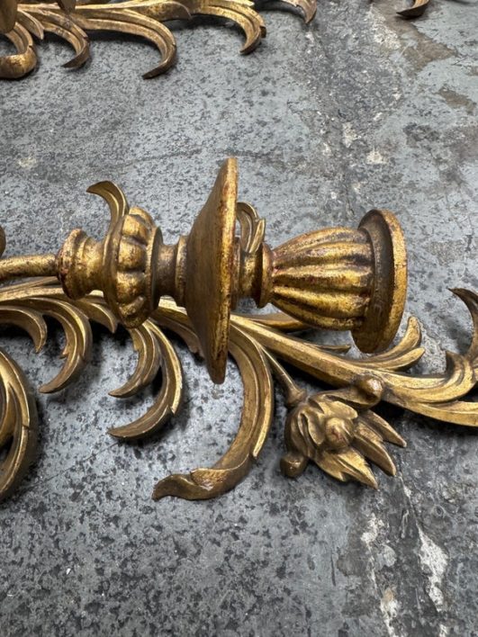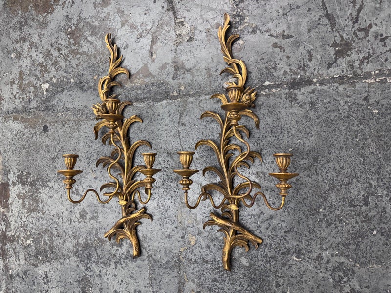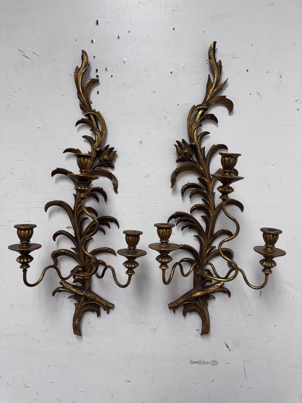 Design Plus Gallery presents a Pair of Candle Sconces. The elaborate carved gilt wood sconces have three points each for tapered candle to rest in. acanthus leaves are plentiful and make up most of the decoration. Both have signs of age that are consistent with use.
