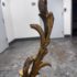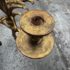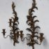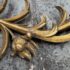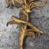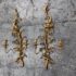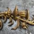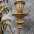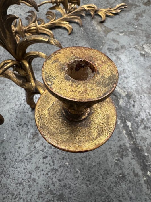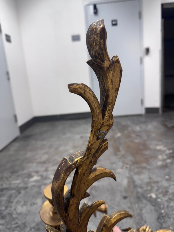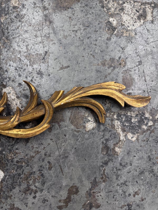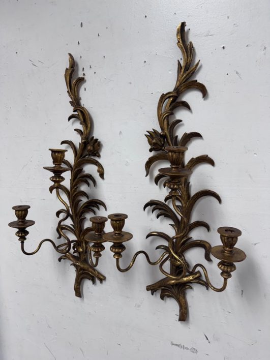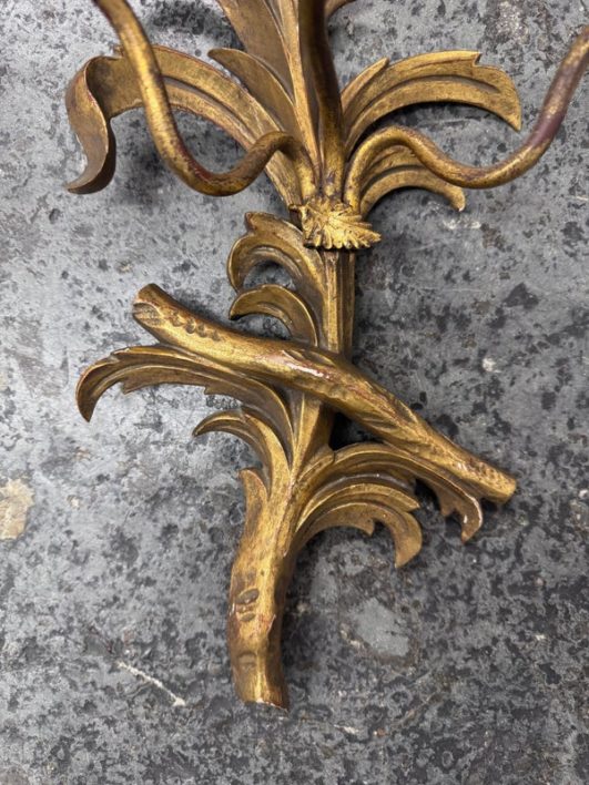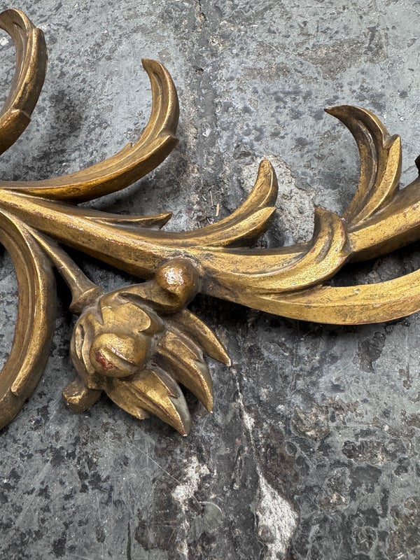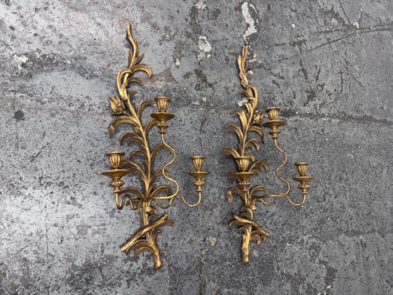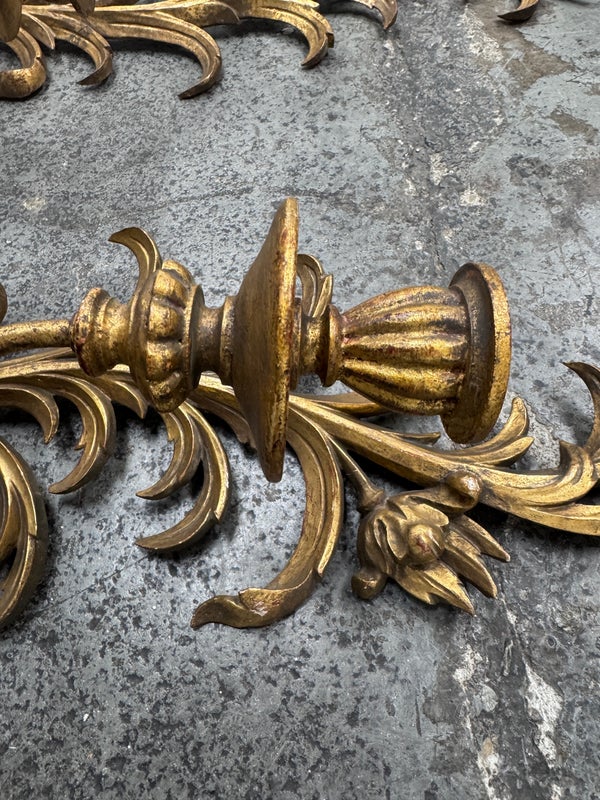 Design Plus Gallery presents a Pair of Candle Sconces. The elaborate carved gilt wood sconces have three points each for tapered candle to rest in. acanthus leaves are plentiful and make up most of the decoration. Both have signs of age that are consistent with use.