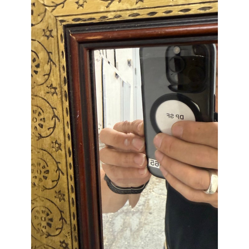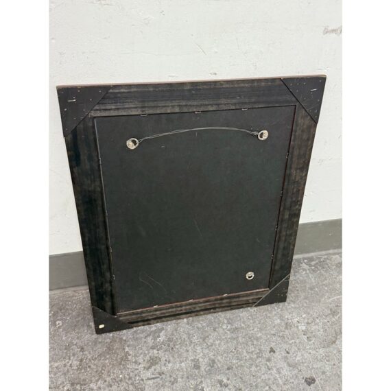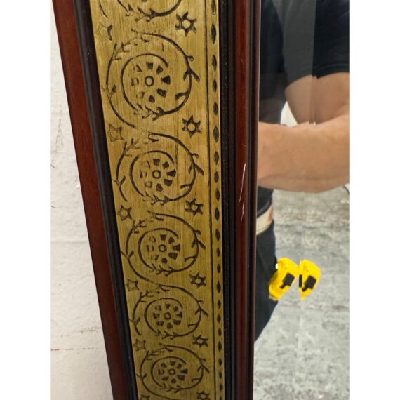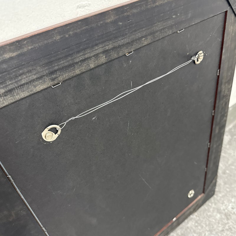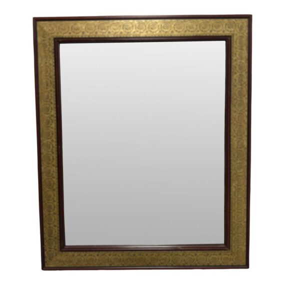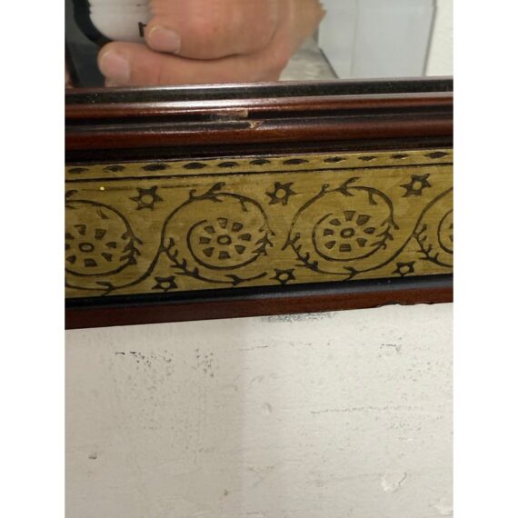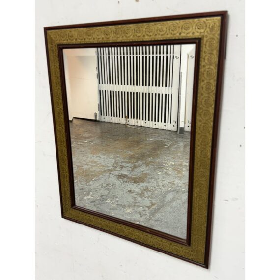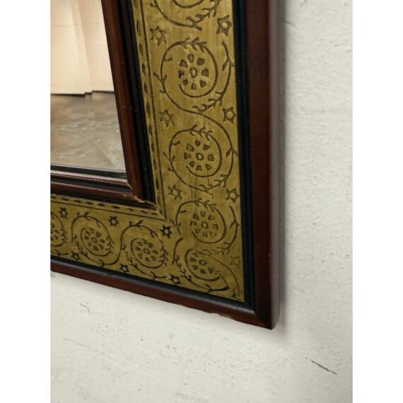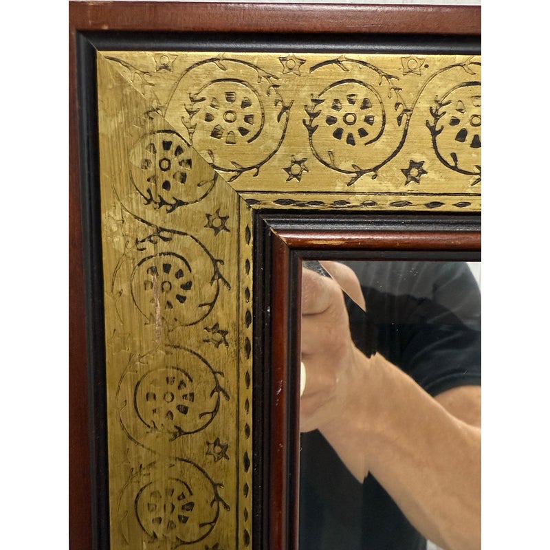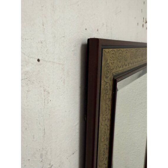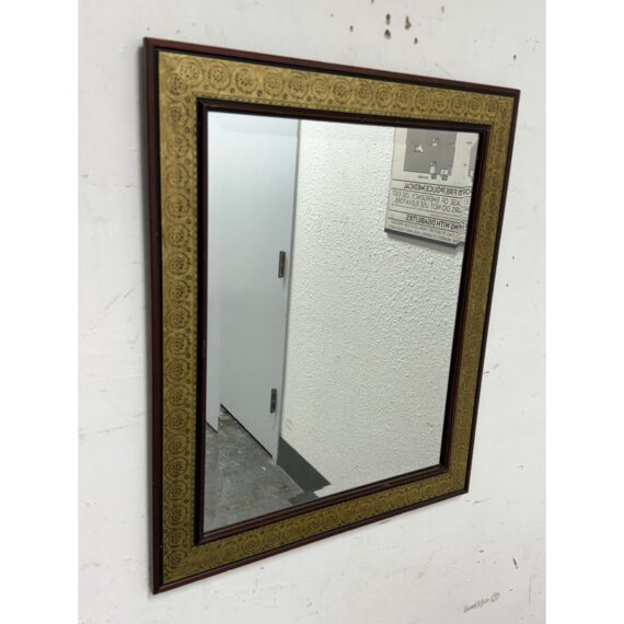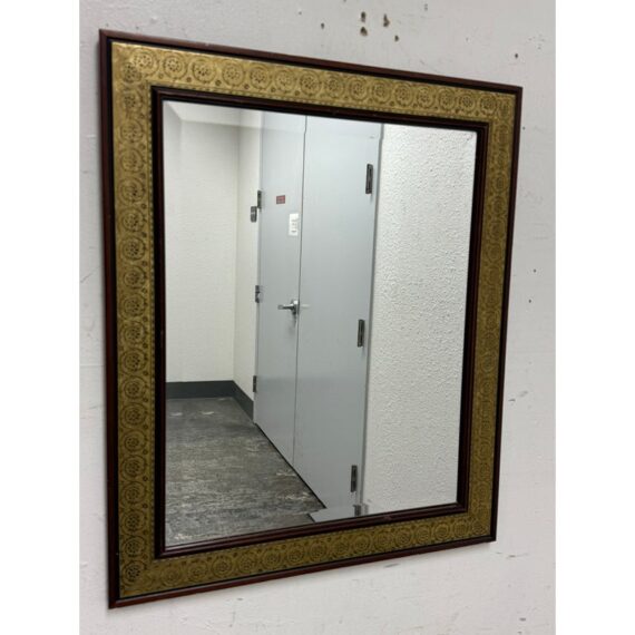 Design Plus Gallery presents a Vintage Wall Mirror with a Golden Frame. The beveled frame has a warm wood tone with a soft gold finish. The gold has swirling accents for subtle ornamentation. Natural distress from age and use—subtle scuffs, wear to the finish, and a timeworn patina—enhances its authentic vintage appeal without overwhelming its graceful silhouette. The beveled glass catches the light beautifully, making it a striking addition to an entryway, bedroom, or living area. Designed to be hung vertically or horizontal. In good condition, minimal wear from usage.