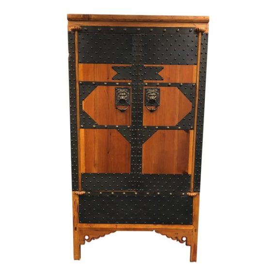 Design Plus Gallery presents a modified vintage solid wood Armoire. The frame is solid wood, includes a lion drop pull handles and metal rivet sheets metal design. It has a shelf with two small pullout drawers inside as well as a hidden storage space in the bottom accessed through a square cover. A great addition for the needed extra storage. Brand Unknown.