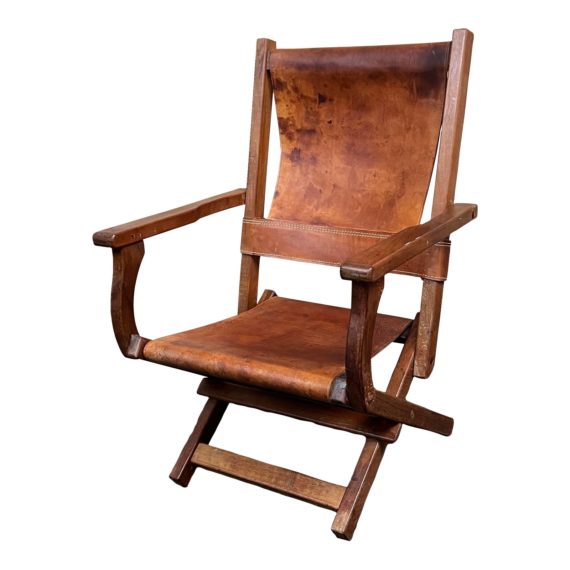 Design Plus Gallery presents a Vintage Folding Arm Chair. Crafted from solid woods and features a rich brown leather sling seat and backing. Hammered nailheads mounts the leather upholstery. These nailheads not only enhance the chair’s visual appeal but also reinforce the leather, ensuring long-lasting use. As a vintage piece, this folding chair shows visible wear from usage and age. Natural distress marks, such as scratches, scuffs, and patina, can be seen on the wood and leather surfaces. These signs of age add character and charm to the chair, making it a unique and timeless piece. With its collapsible design, this is not only practical but also easy to store and transport. Whether used as a dining chair, a desk chair, or an occasional seating option, this chair is a perfect blend of vintage aesthetics and functionality. Visible and minor wear from usage + age.