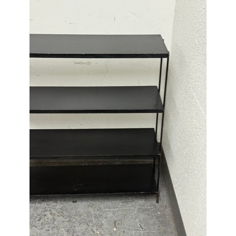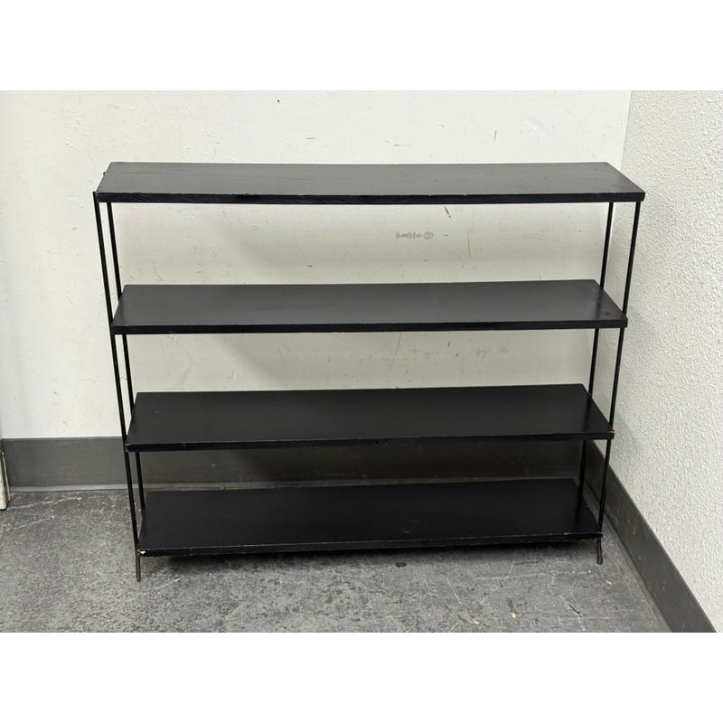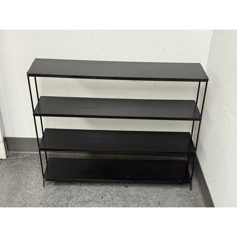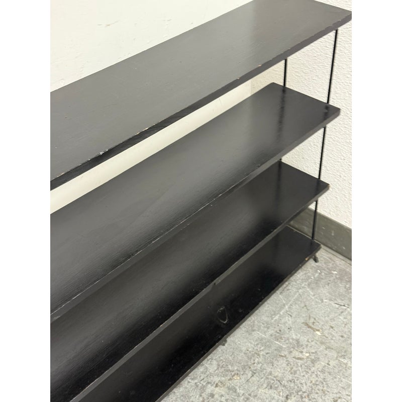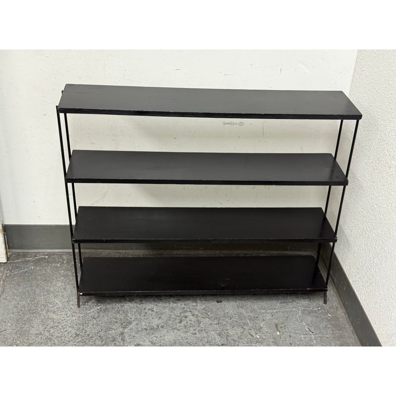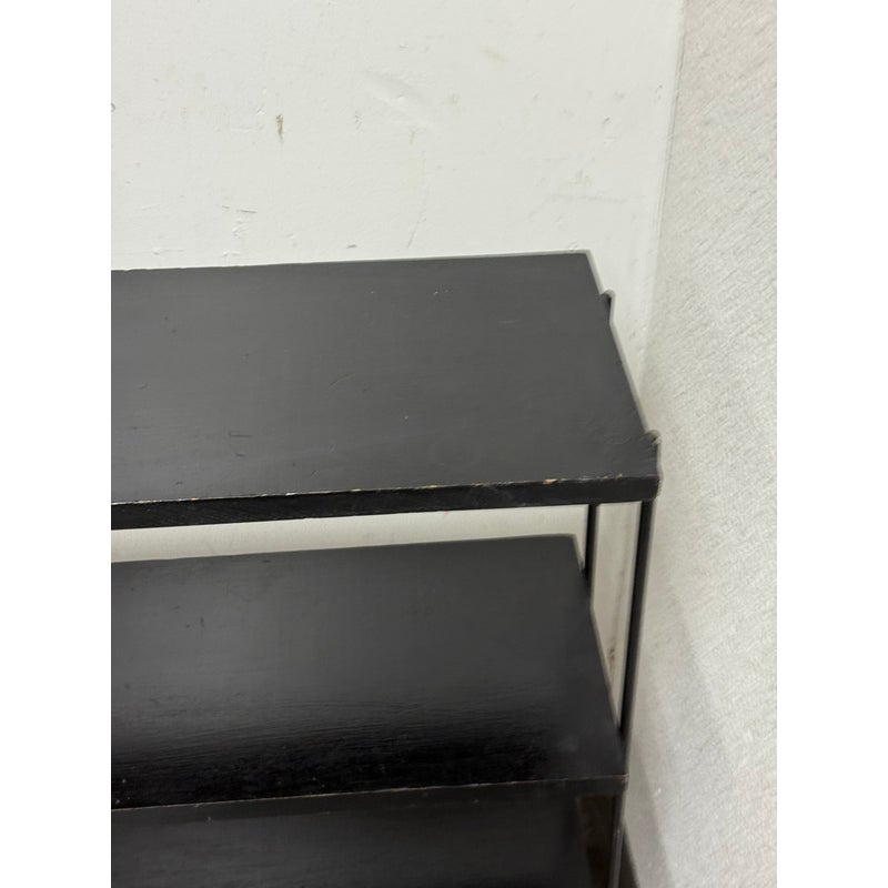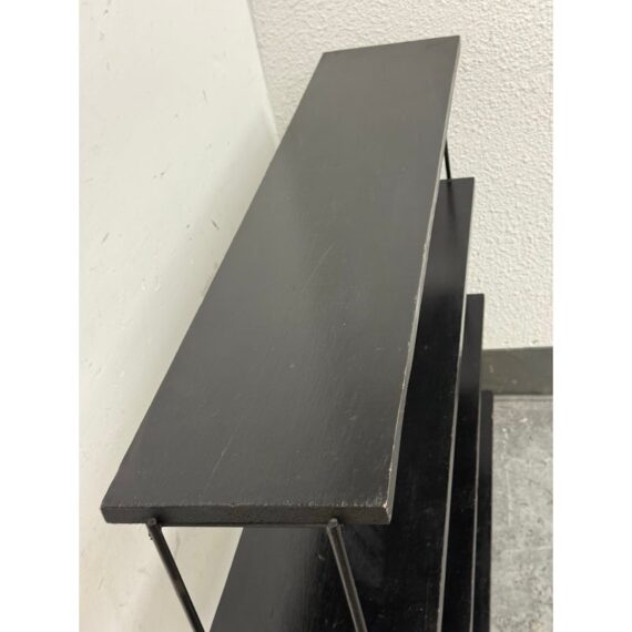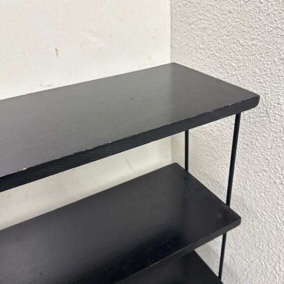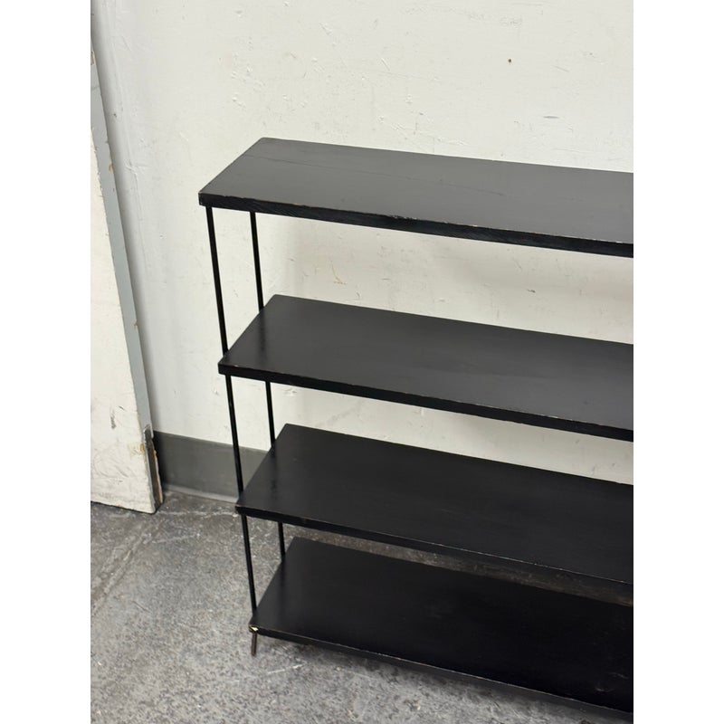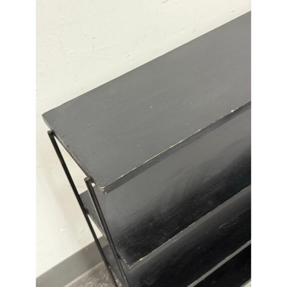 Design Plus Gallery presents a Vintage Bookcase/Etagere. The wood is richly distressed, displaying visible marks, scratches, and areas where the finish has worn away, all telling a story of years of use. Features four shelves. While the shelf shows appeal, it is not entirely stable and has a noticeable, slight wobble—adding to its authentic vintage feel. In good condition, visible wear from usage.