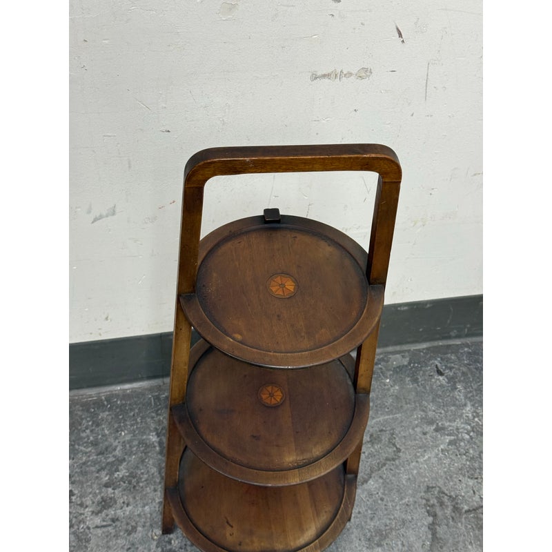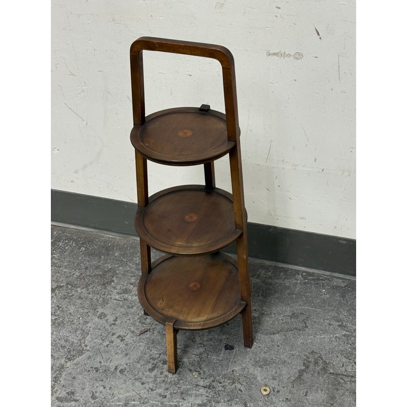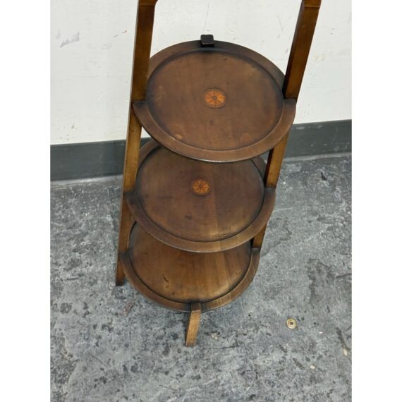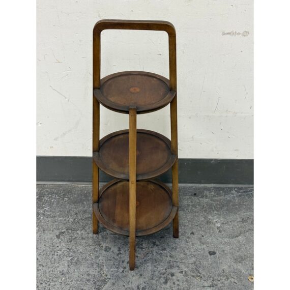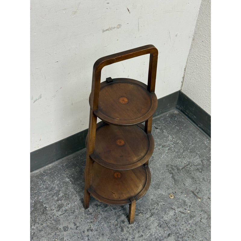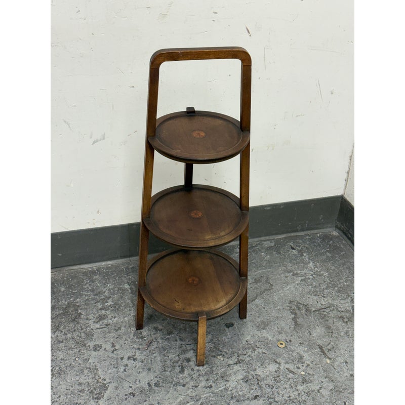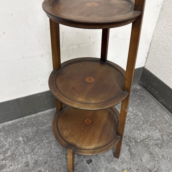 Design Plus Gallery presents a Triple Tiered Stand of a Vintage Age. The stand is made from solid wood that is sturdy but lightweight enough to move around with ease. It is useful for a variety of home purposes and will be a nice piece sure to garner compliments. The tiers are staggered in diameter going from small to large, each having an identical inlay in their center. Overall the vintage stand shows signs of wear that is consistent with its age + use.