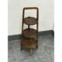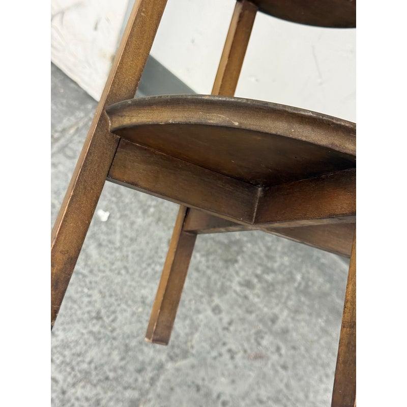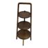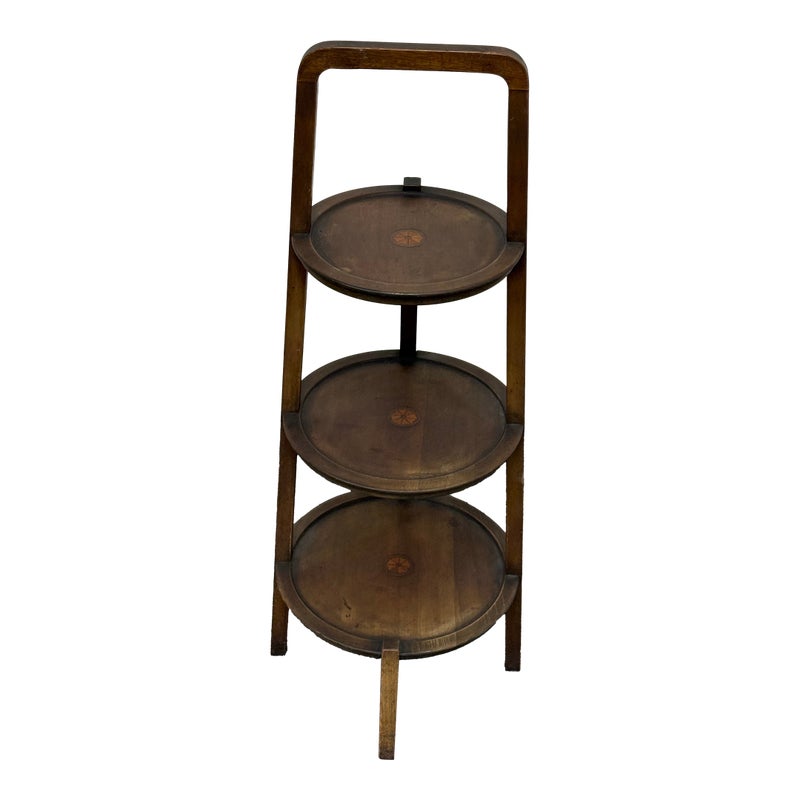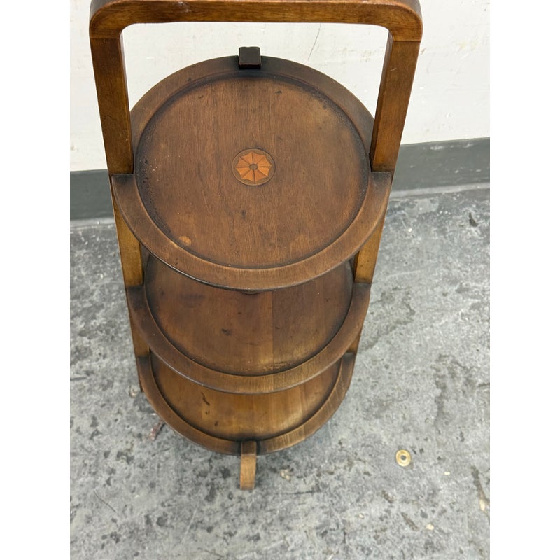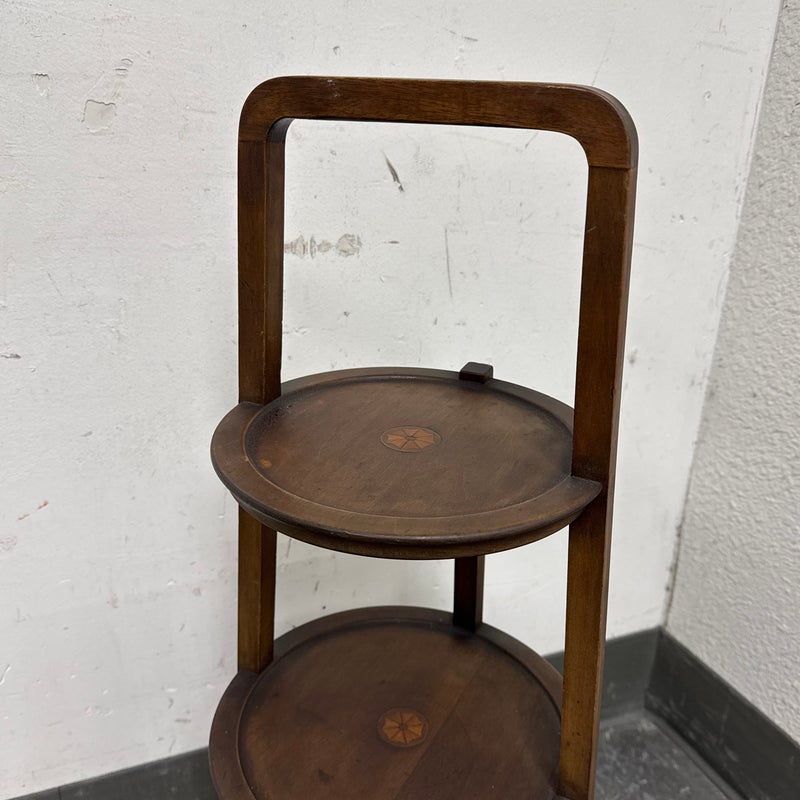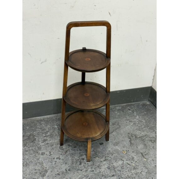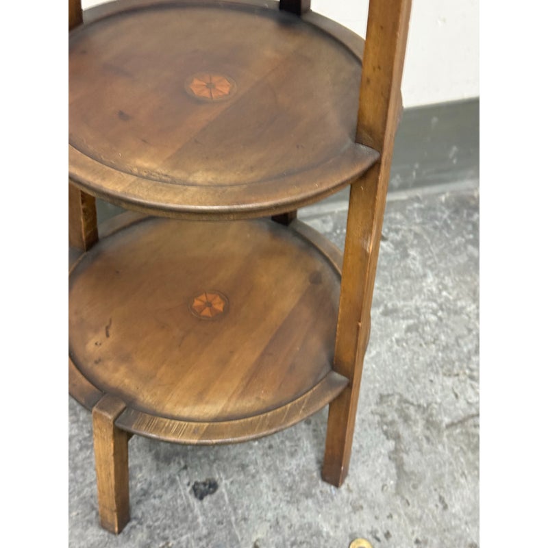 Design Plus Gallery presents a Triple Tiered Stand of a Vintage Age. The stand is made from solid wood that is sturdy but lightweight enough to move around with ease. It is useful for a variety of home purposes and will be a nice piece sure to garner compliments. The tiers are staggered in diameter going from small to large, each having an identical inlay in their center. Overall the vintage stand shows signs of wear that is consistent with its age + use.