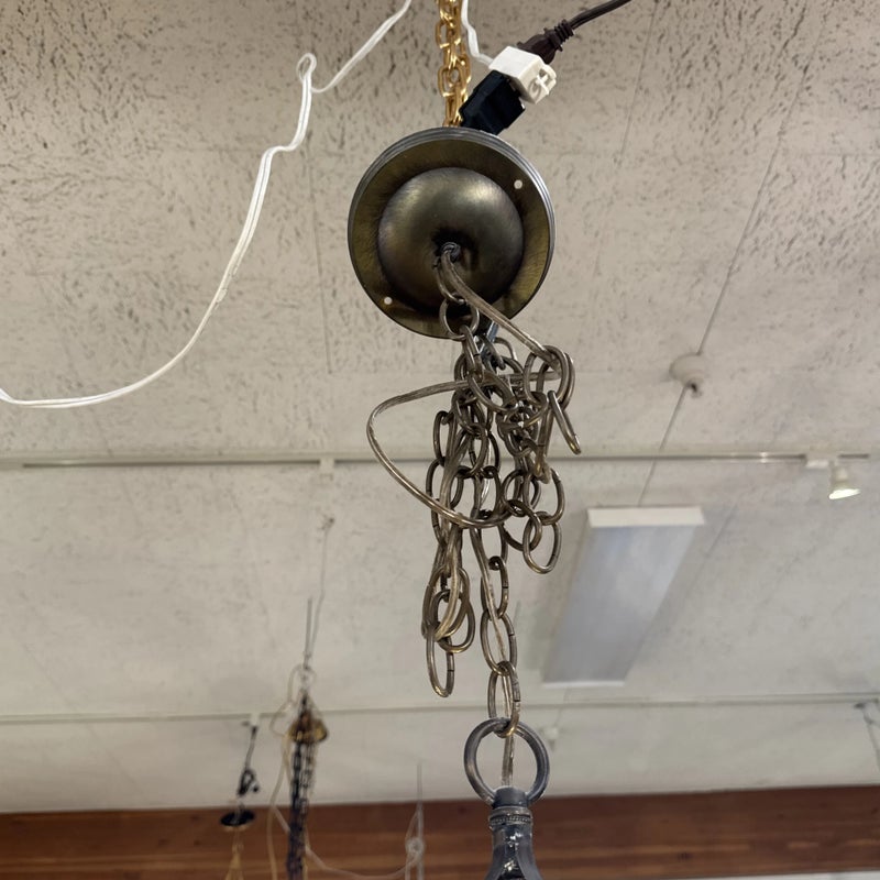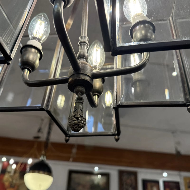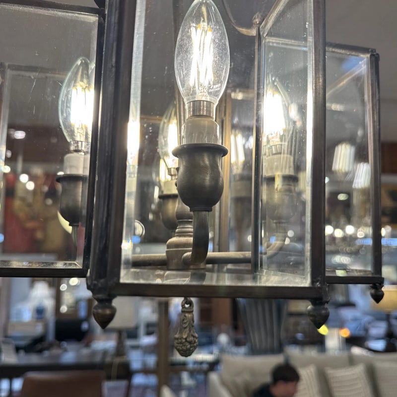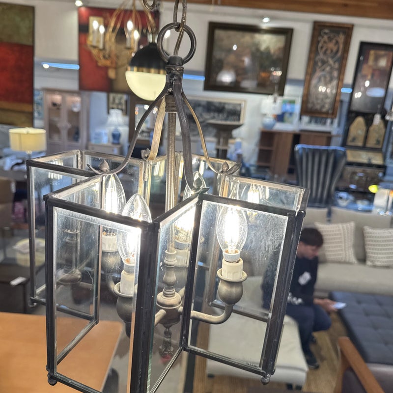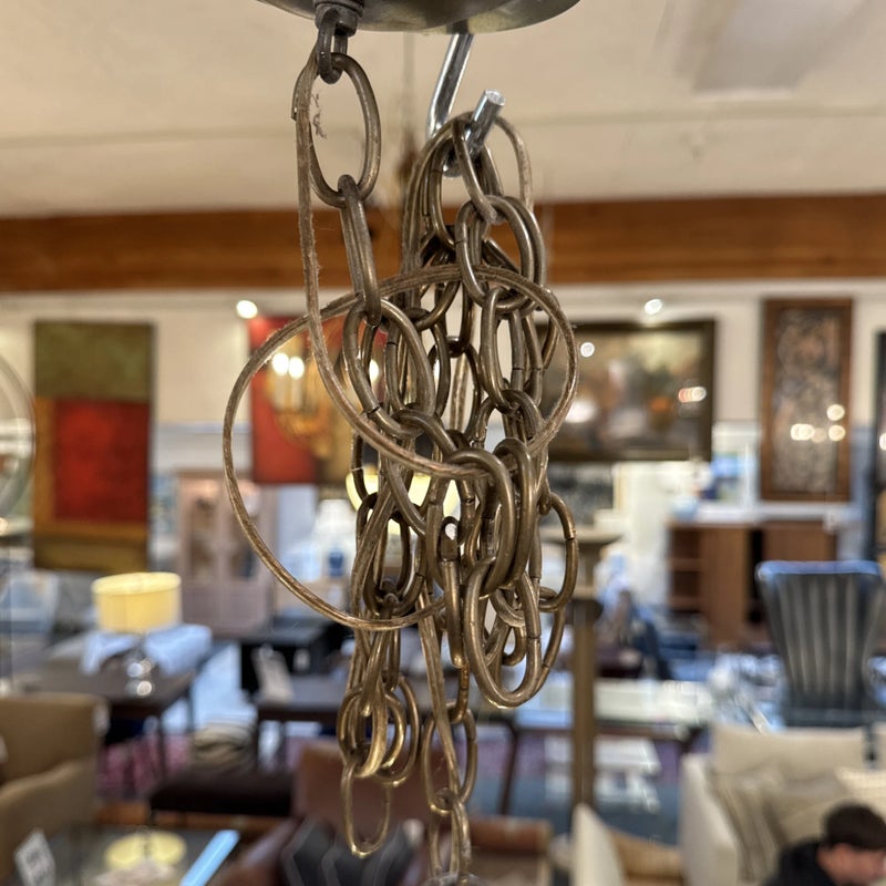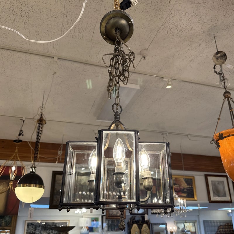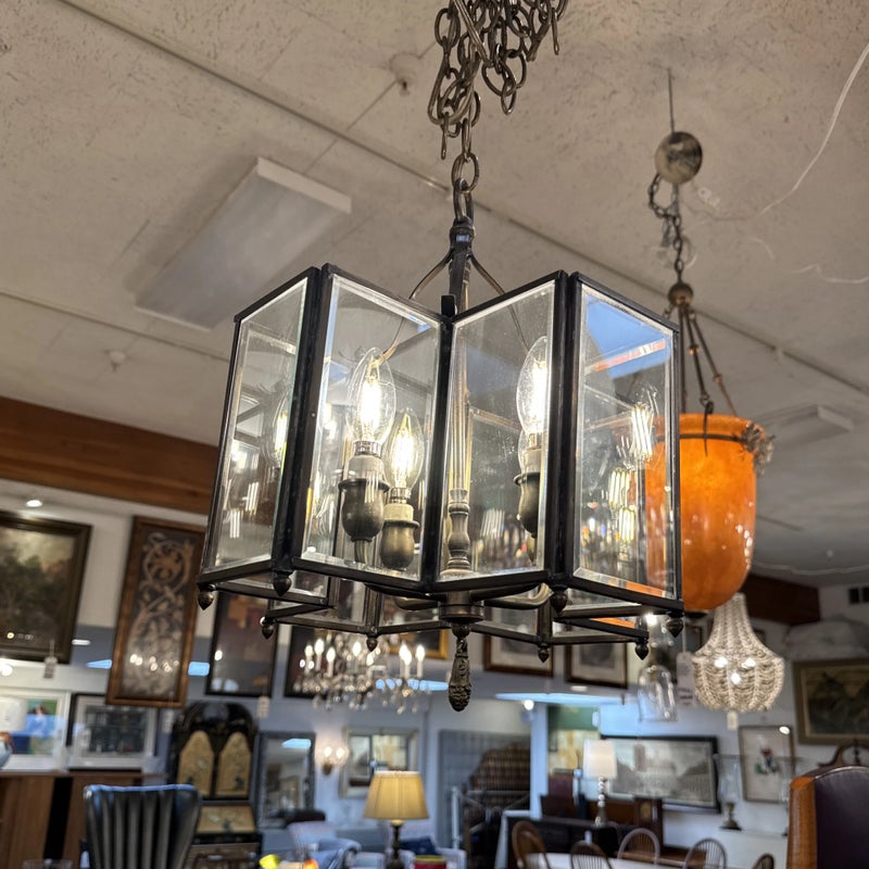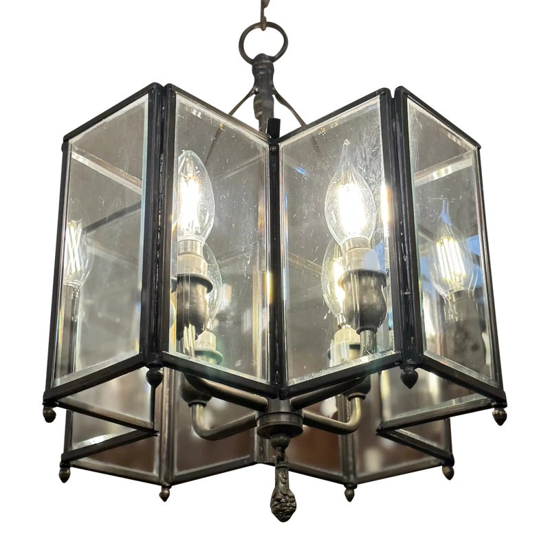Design Plus Gallery presents a Vintage X Shaped Chandelier. Unusual for the silhouette and amount of beveled glass panels, the four lights bring a special glow to any space. A 48″ long chain allows adjustment. Light surface wear; missing mounting plate; condition is consistent with age and use.