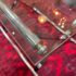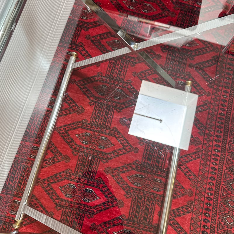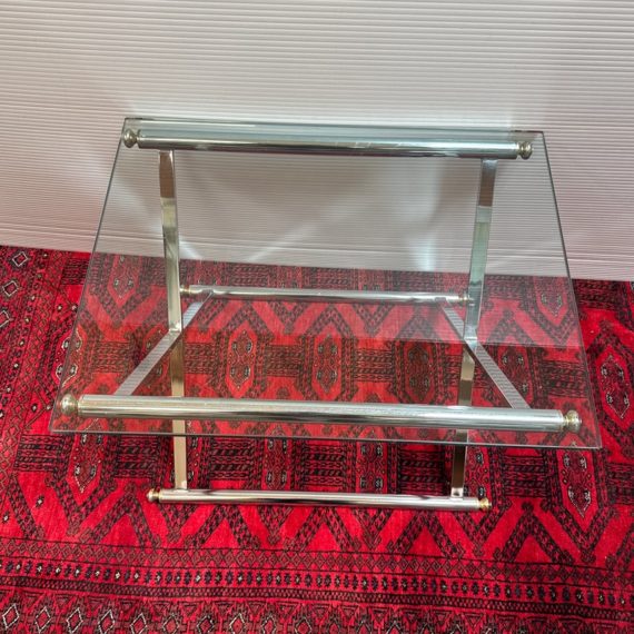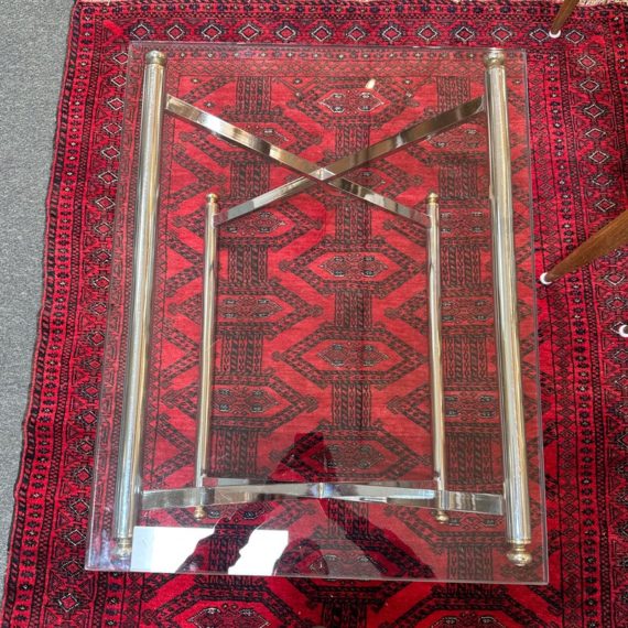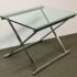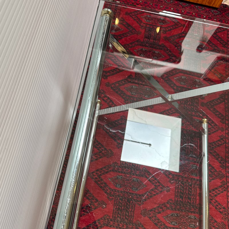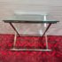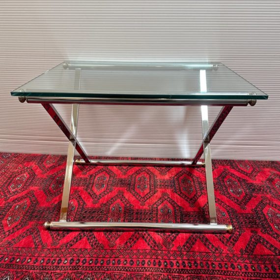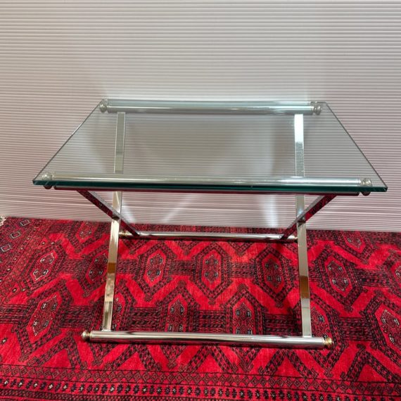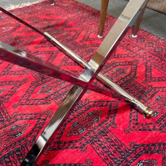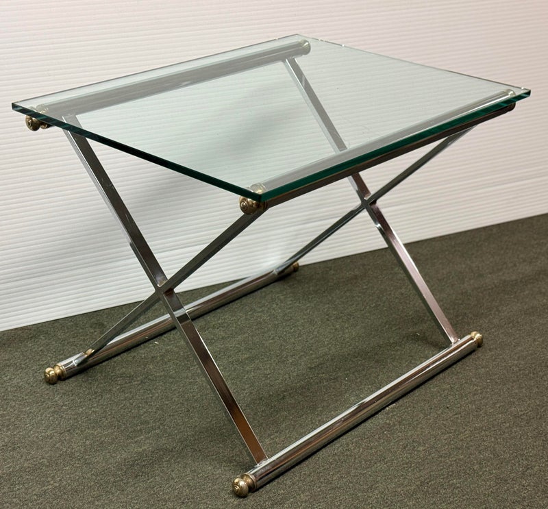 Design Plus Gallery presents a Vintage Simplified Glass + Chrome Side Table. The chrome metal table has an X base that crosses itself for center stability and support. Nice rectangular glass surface with exposed edges. Is in good condition for its vintage age + use with visible minor wear.