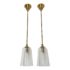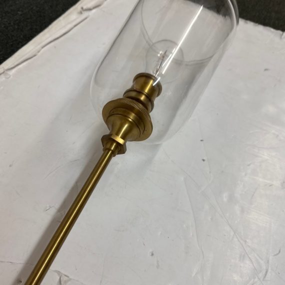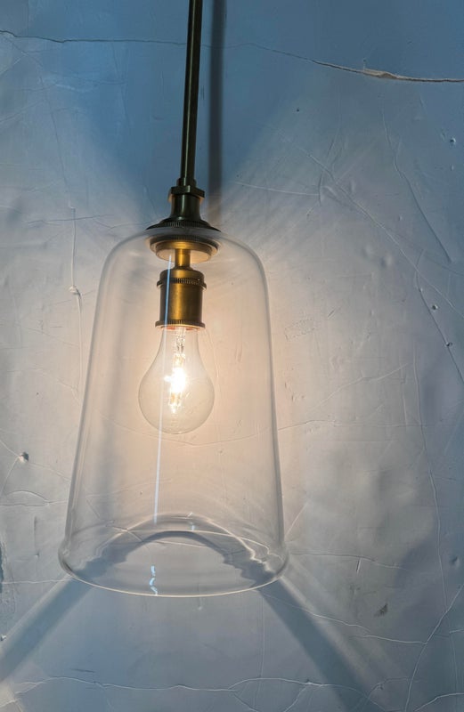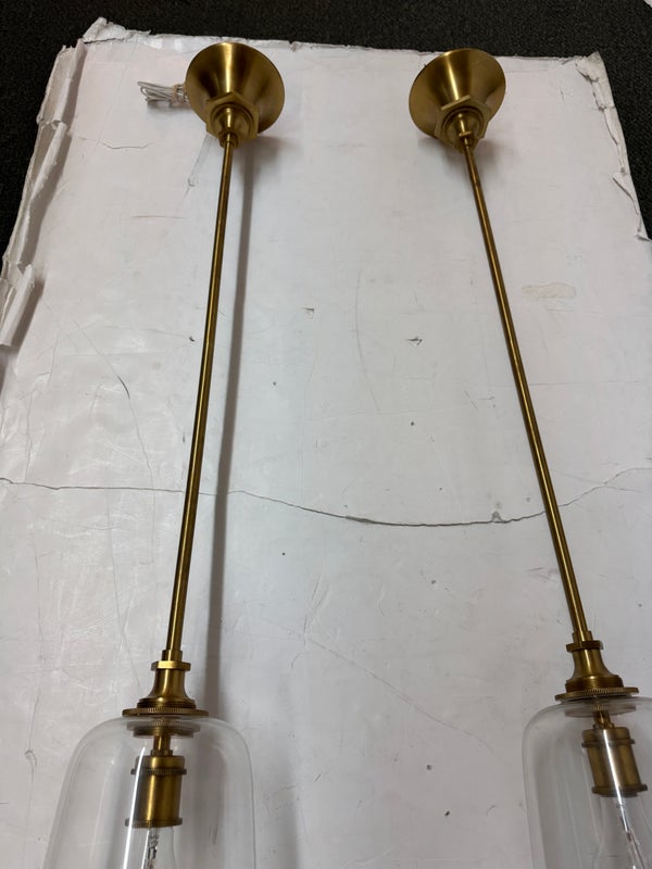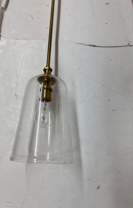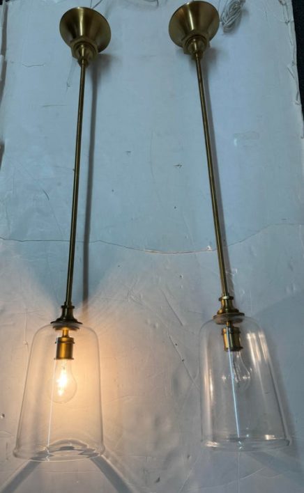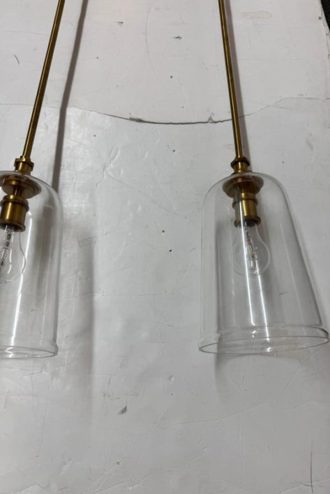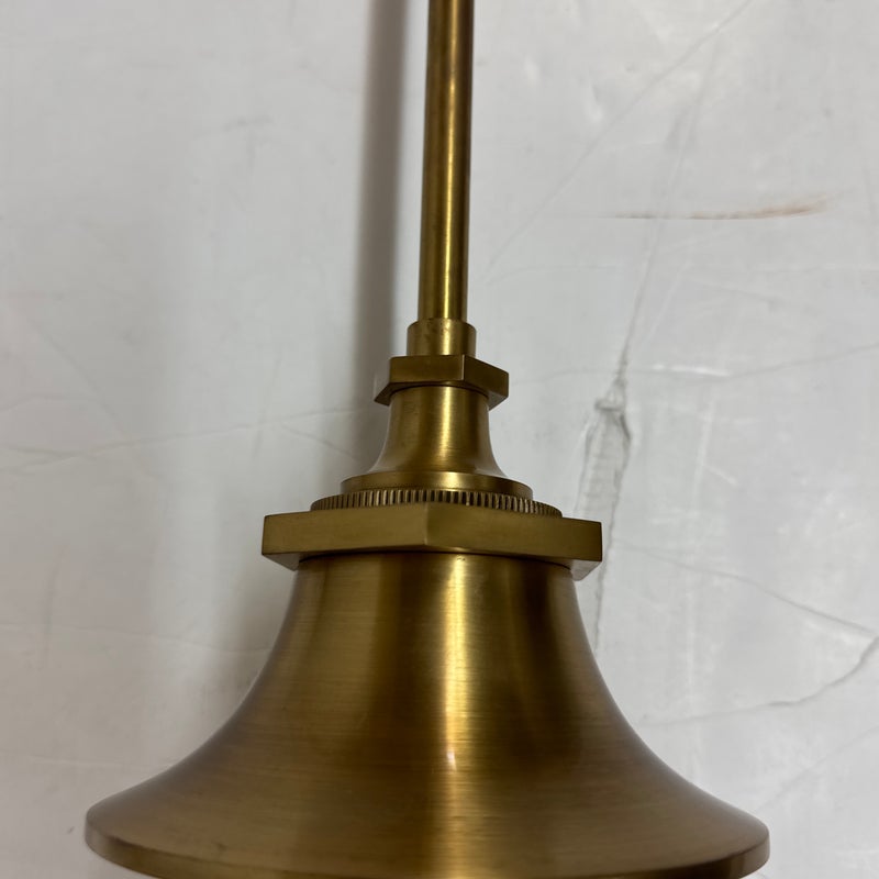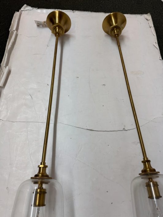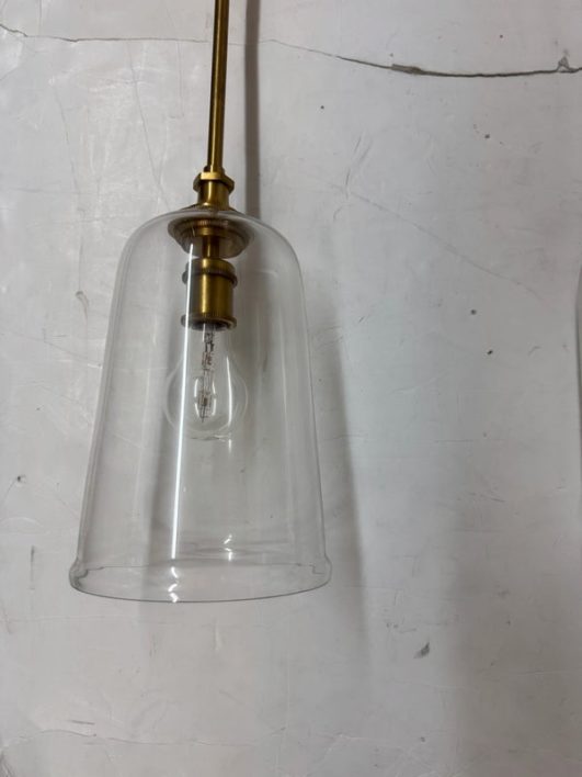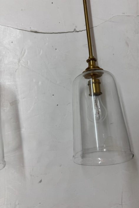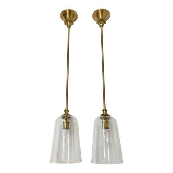 Design Plus Gallery presents a pair of Transitional Pendants Light by Visual Comfort. Classic details in brass create this elegant light. Simple clear glass “bell” creates the transparent trade. Little wear condition is good for age and use.