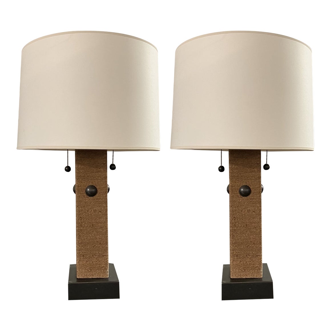 Design Plus Gallery presents a Pair of Visual Comfort Grasscloth Pillar Table Lamps. Discontinued styles blends a variety of textures and styles into these transitional pieces. Bronze bases supports the grasscloth wrapped columns with oversize bronze nailhead detail. Double pull drop chains echos the geometry. A modern and simple ivory rice paper barrel shades tops the pair of with matching finials. Minor wear through out, pair is in good condition.