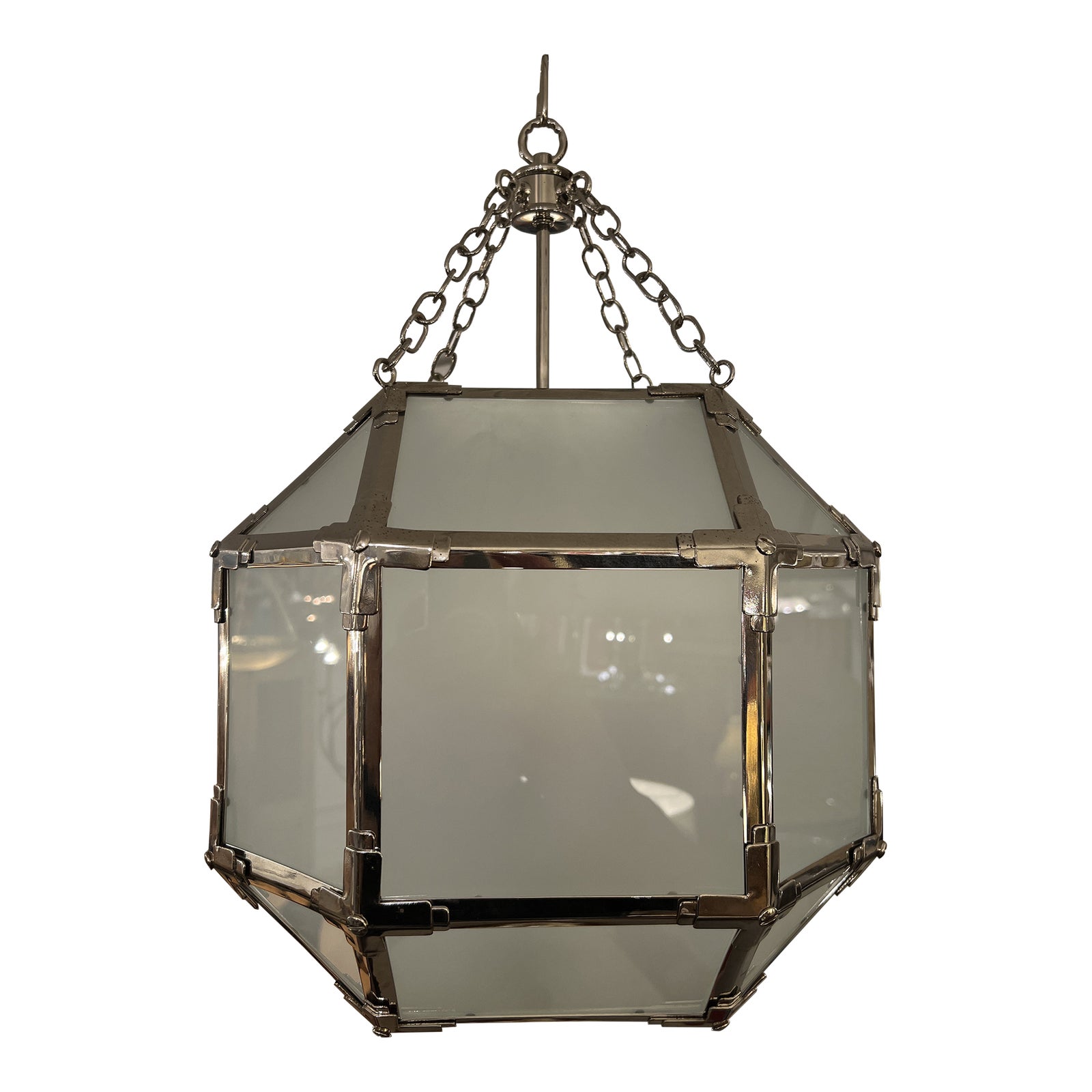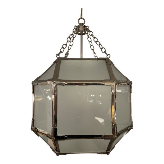 Design Plus Gallery presents a Morris Lantern Pendant, designed by Suzanne Kasler for Visual Comfort. The pendant’s frame is constructed with nickel and given a polished finish. Pieces of frosted glass are secured within the frame. The pendant uses three candelabra bulbs. Minor wear consistent with use; pendant is in good condition.