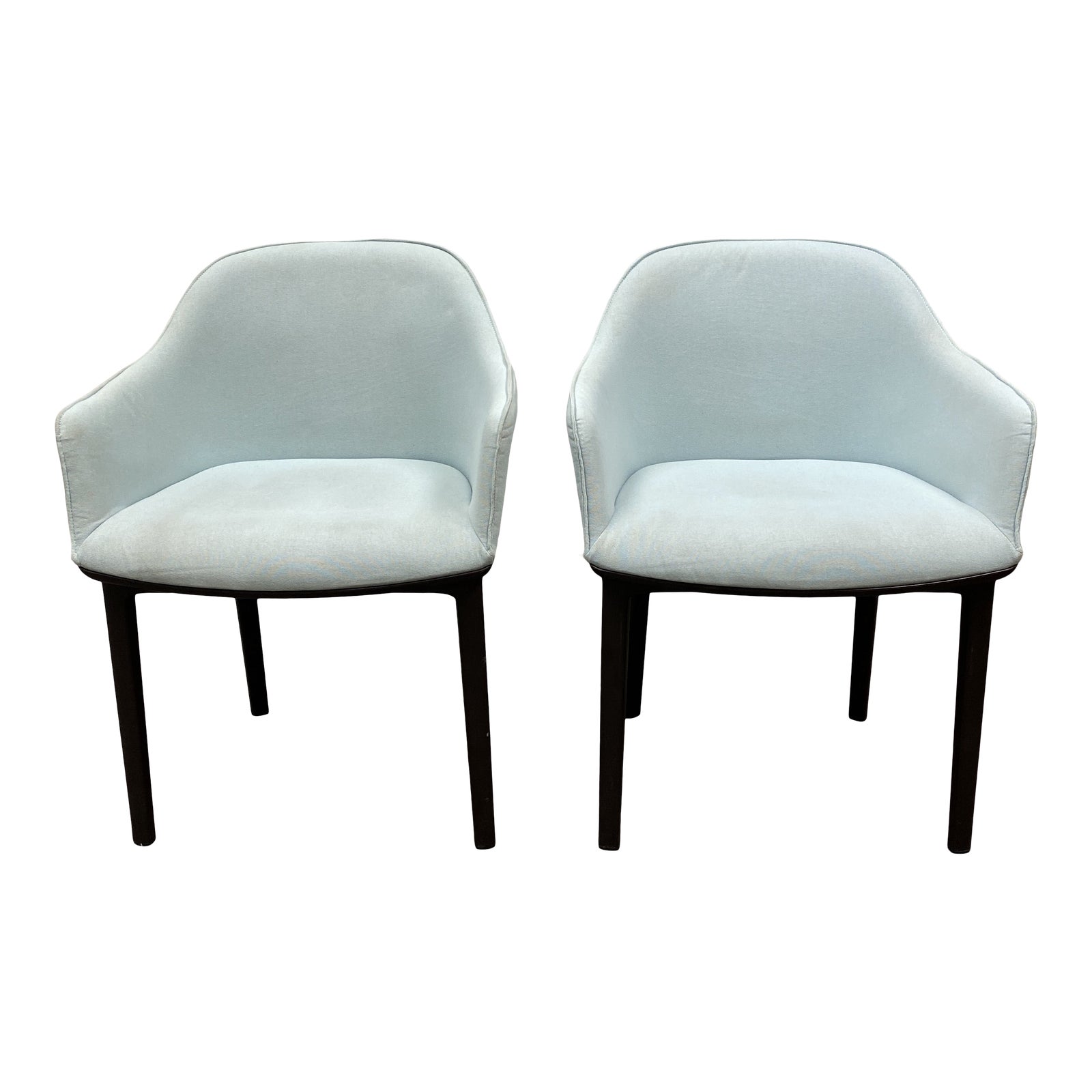 Design Plus Gallery presents a Pair of Softshell Chairs by Vitra. Designed by Ronan & Erwan Bouroullec in 2008. Exceptional comfort: flexible ribs are concealed in the back shell and adapt to the user, providing freedom of movement. This the four-legged version of the elegant, lounge-style chair can be combined with a wide selection of dining tables. Upholstered in a Light Blue fabric with a dark finish base. Minor wear.