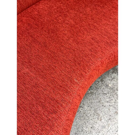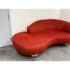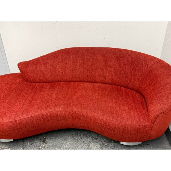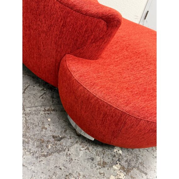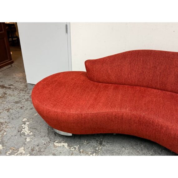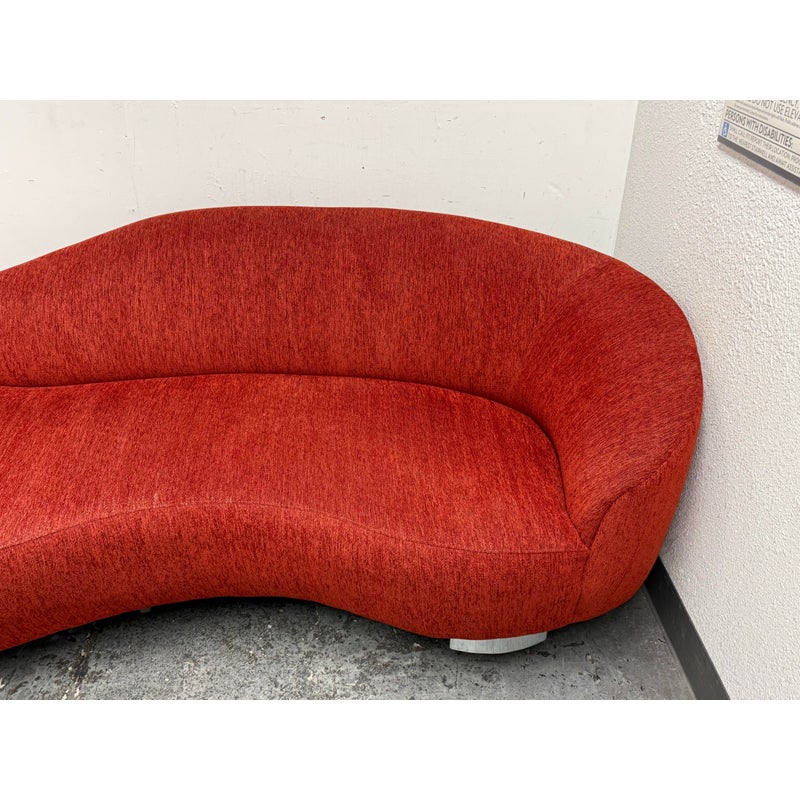 Design Plus Gallery presents Serpentine Mambo Style Sofa in the manner of Vladimir Kagan for Directional in the late 1980s. The sofa has a shapely, serpentine silhouette with their textured woven chenille like fabric in a ruby red like color. There is a rounded seat back that is also low profile and it curves around one end of the seating area. This is an iconic design style that is should always be proudly displayed and lusted after. Overall the sofa is in good condition for its usage.