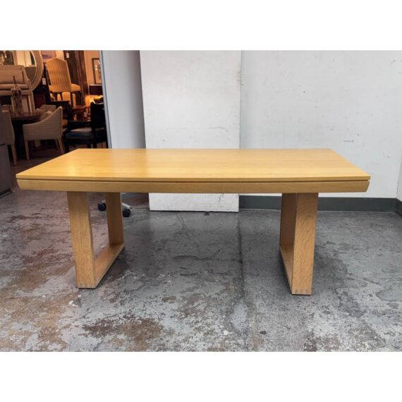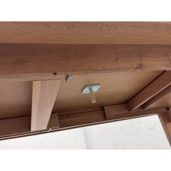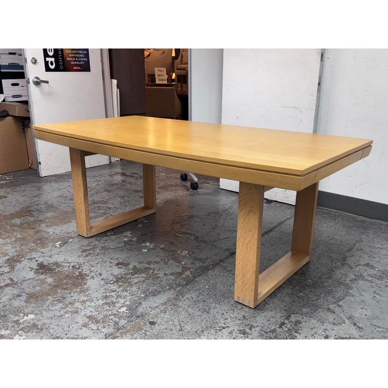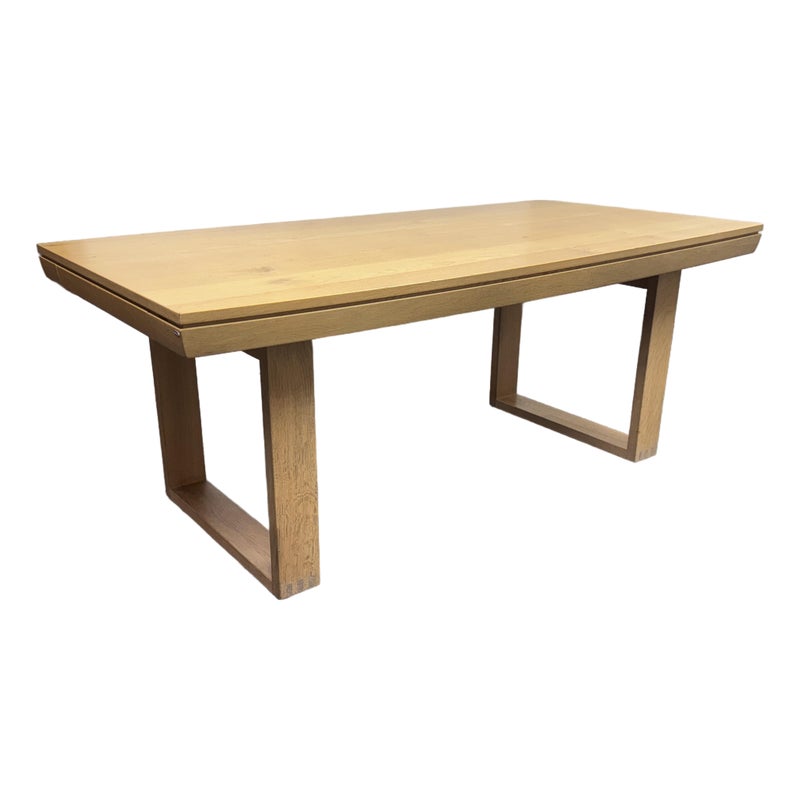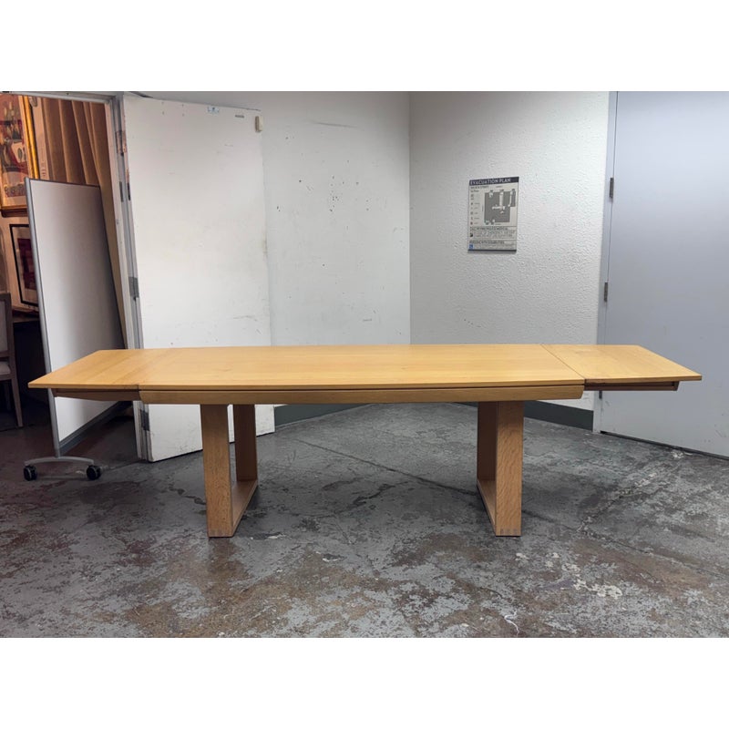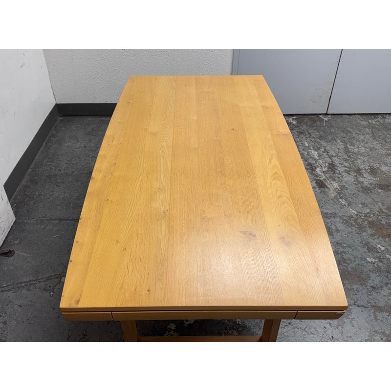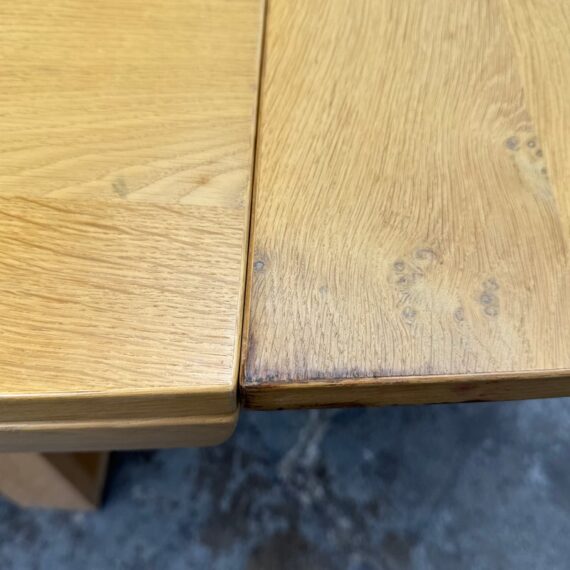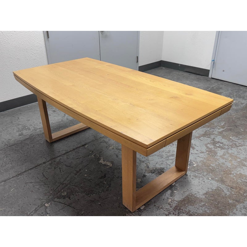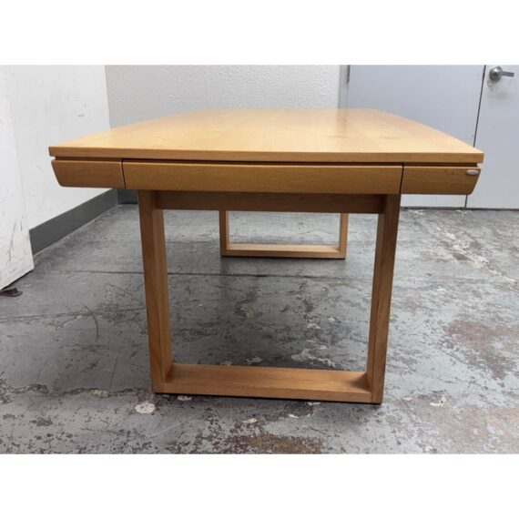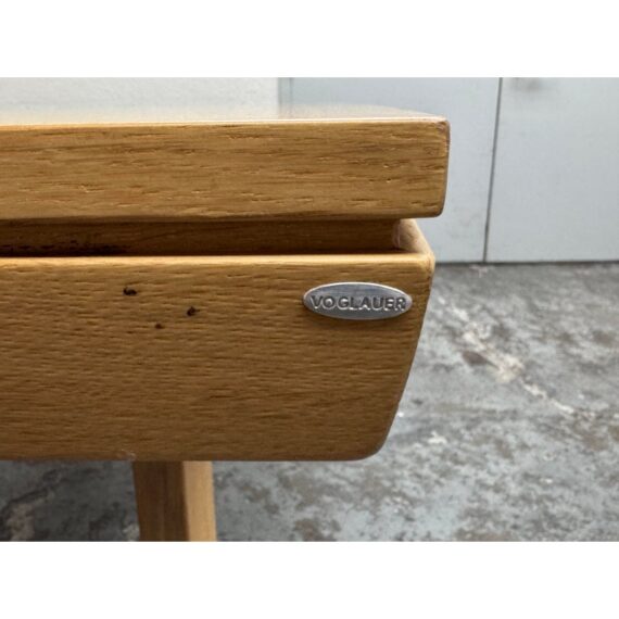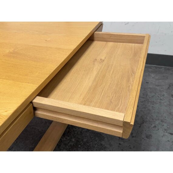 Design Plus Gallery presents an Extension Table with Wild Oak Wood from Esteemed European Manufacturer, Voglauer. The table extends from a rectangular shape to have extending on their outside that make it a near oval presence. A thoughtful shallow drawer is found at one end of the table. This table is from a brand that specializes in the production of high-quality solid wood furniture. The table boasts many industry awards and certificates confirming its fully ecological production – the wood used comes from renewable forests. This style has been discontinued by the brand. Visible wear is present to the solid wood grain that retouching should solve. Made in Austria.