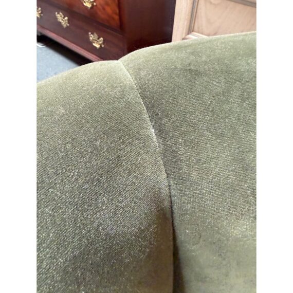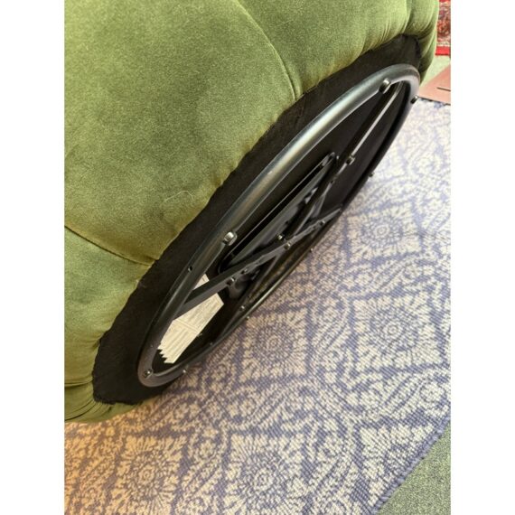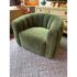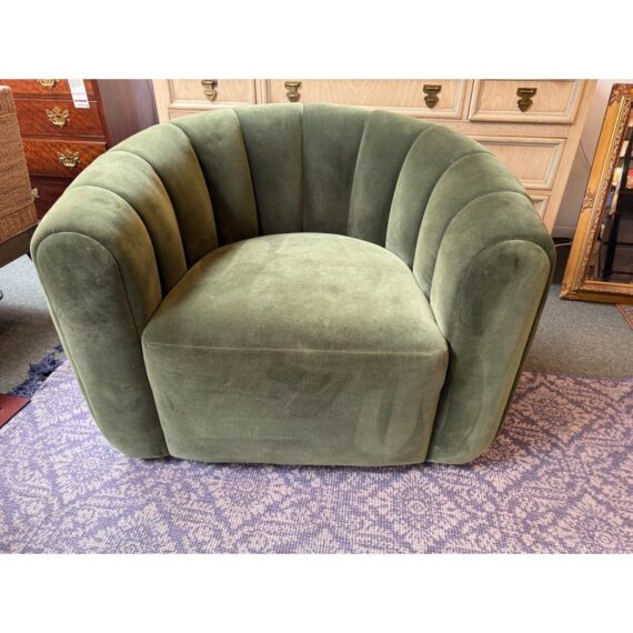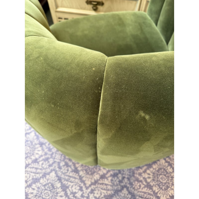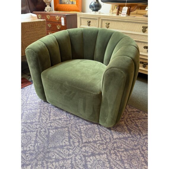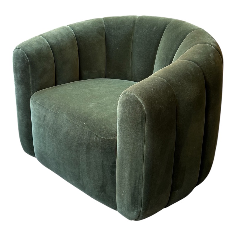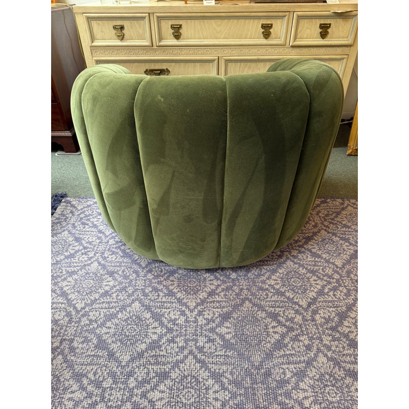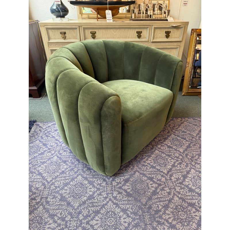 Design Plus Gallery presents the Fitz Channeled Velvet Swivel Chair from CB2. Channel-tufted in rich green velvet, this deco-inspired swivel chair makes a vintage statement wherever it sits. Designed by VUUE and crafted of hardwood certified sustainable by the Forest Stewardship Council, the chair looks good from every angle. It shows some gentle wear for its use and is in good overall condition.