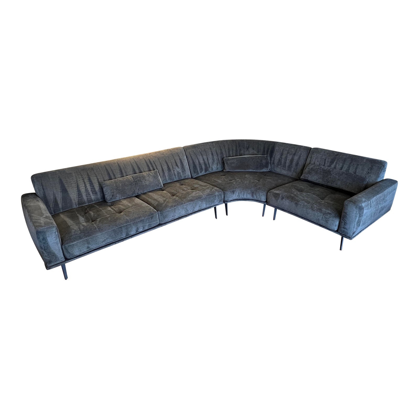Design Plus Gallery presents The Idalia Sectional by W. Schilling for Scandinavian Designs. The upholstered 3pc Sectional brings comfortable contemporary style to your home. The slim track arms along with the Anthracite metal base that elevates with tall tapered legs, creates a lighter feel. Upholstered in performance LiveOn fabric (94% Polyester/6% Nylon) in a dark gray textured fabric. Little evidence of wear; good condition.