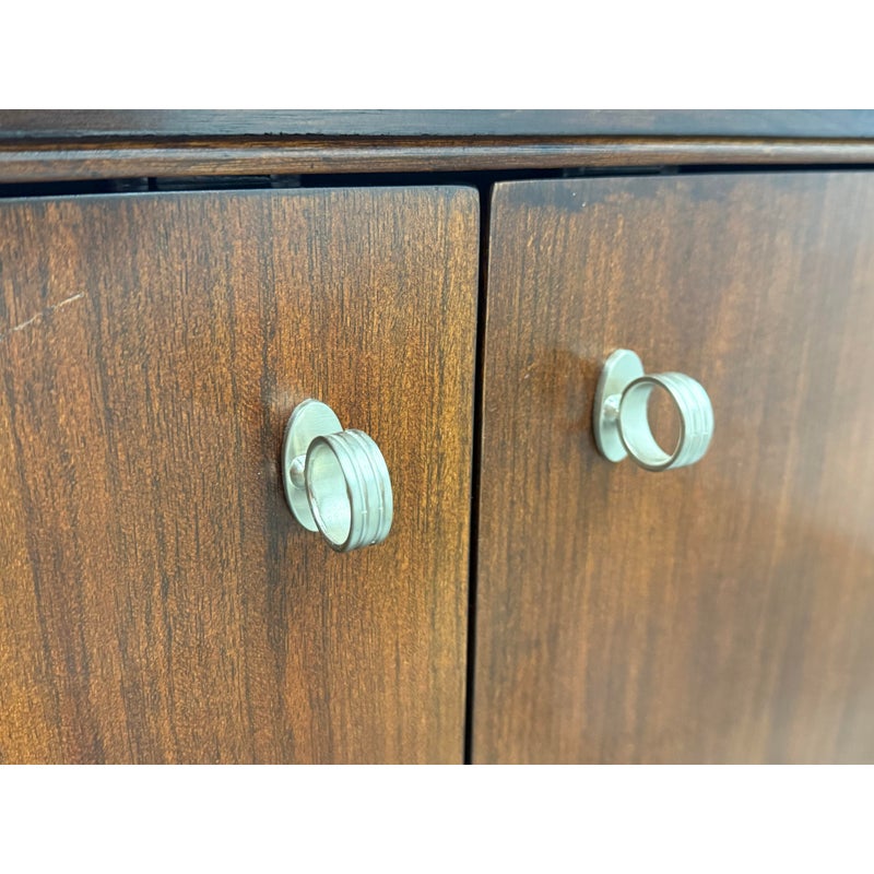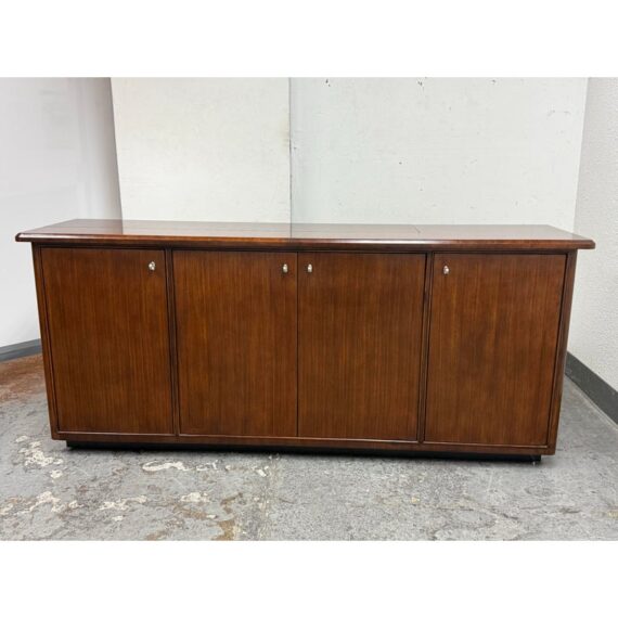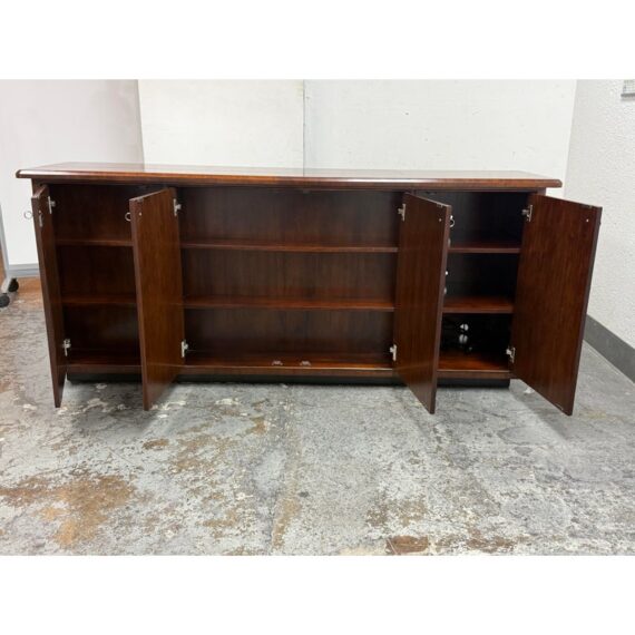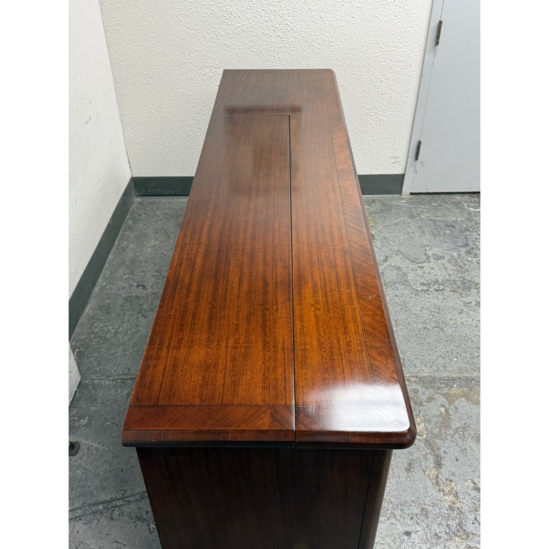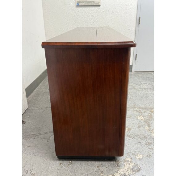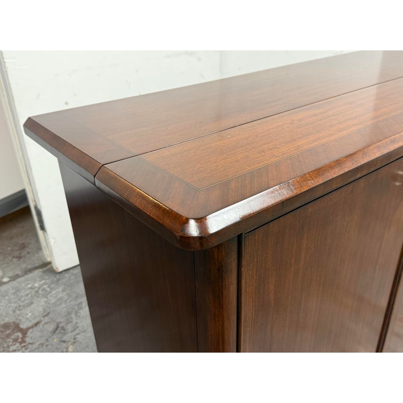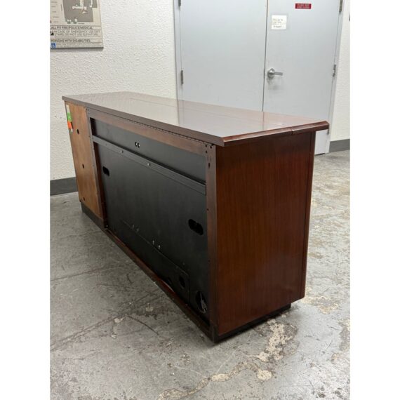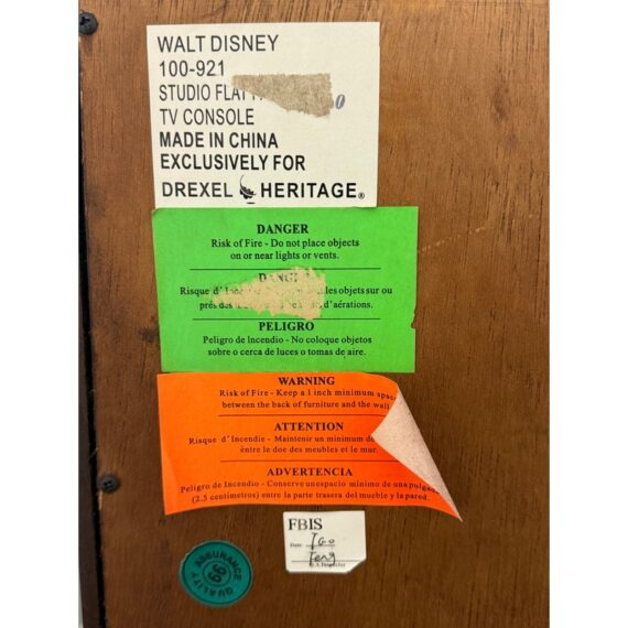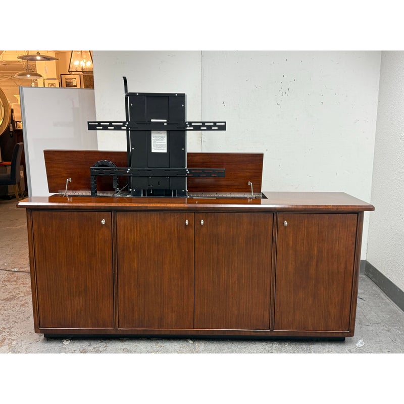 Design Plus Gallery presents a Walt Disney Signature Flat Panel Screen Lift Console from Drexel Heritage. A rare, mid-century–inspired piece from the Walt Disney collection, this flat panel screen lift console captures the elegance and ingenuity of Walt’s own office and living spaces. Designed as furniture-first media storage, it blends clean lines, refined hardware, and a dark, warm finish to keep technology discreetly integrated while elevating the room.Crafted to the superb standards of Drexel Heritage, the console reflects a collection dedicated to keeping Walt Disney’s vision and innovation alive through thoughtful design and enduring quality. Four doors with silver-finish ring pulls. Three hidden compartments with two adjustable shelves for flexible organization. In good condition, visible and minimal wear form usage. This is a discontinued model.